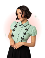 The Casey Mint Blouse is a semi-fitted, mint-colored button-down blouse featuring a black center trim and a curved neckline for a sophisticated look. Princess seams at the front and back create a sleek silhouette, while the short puff sleeves have elasticated cuffs for added comfort. As if this blouse couldn't get any cuter, the black ribbon bow detailing on the front completes your new favorite outfit.