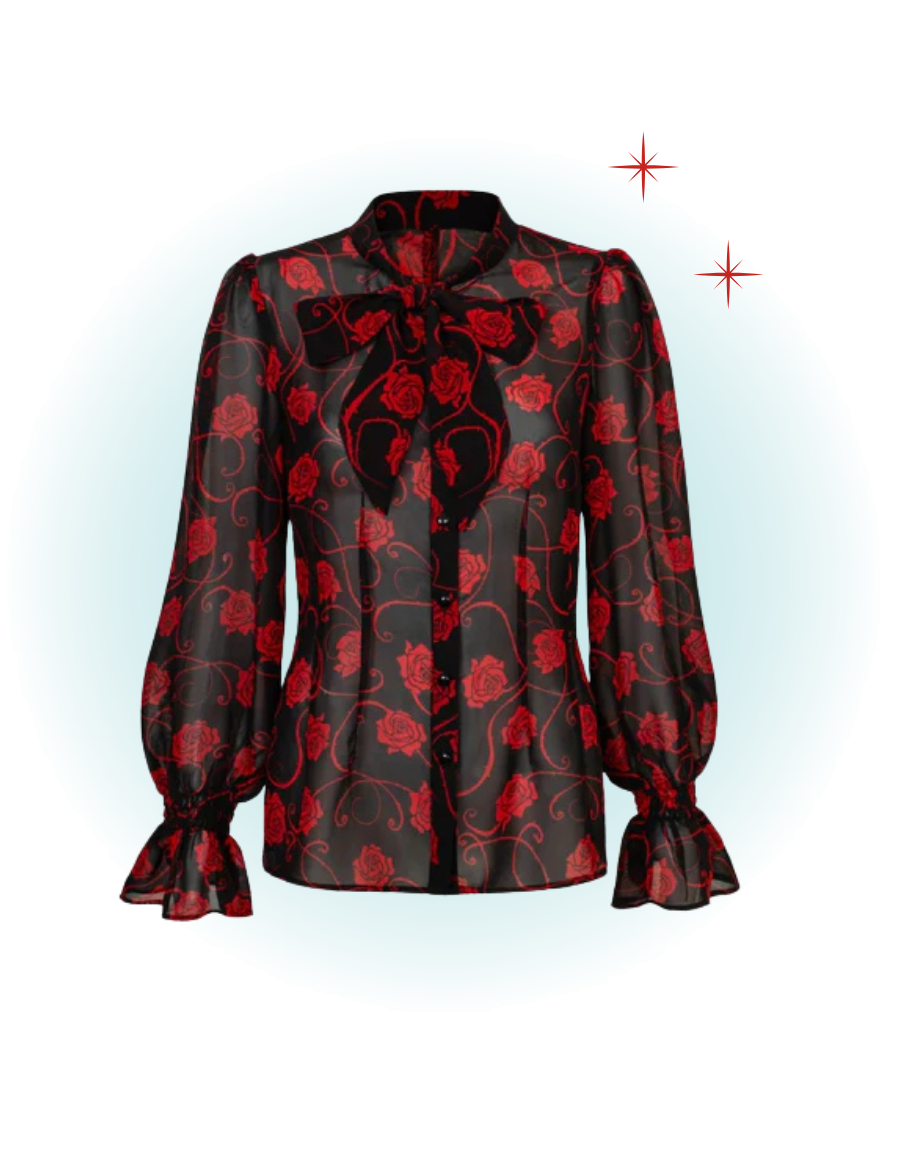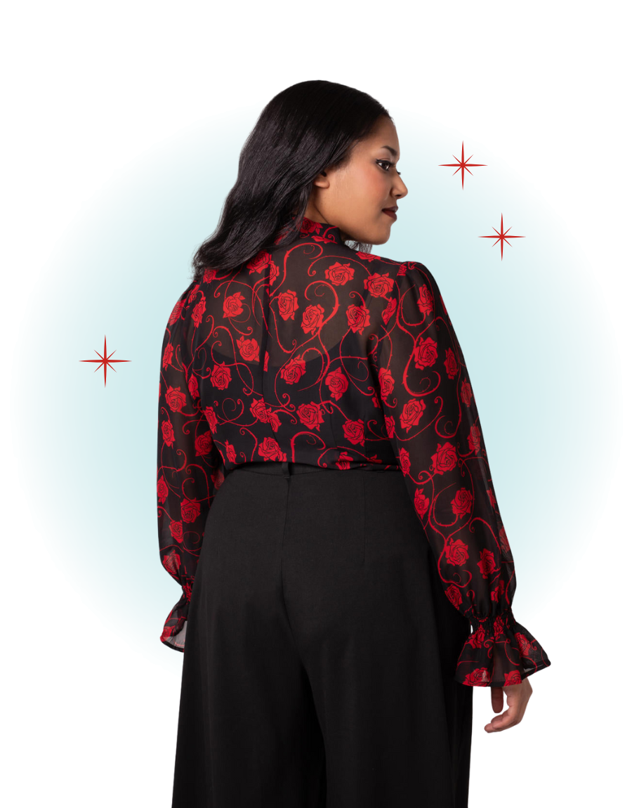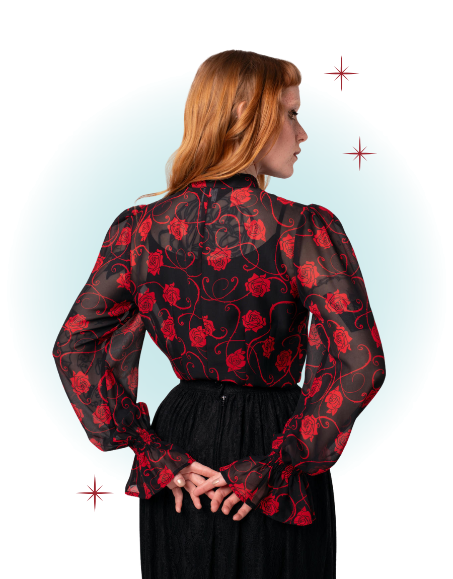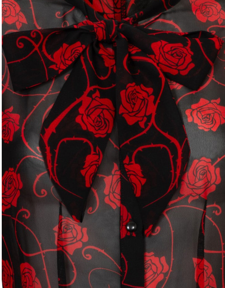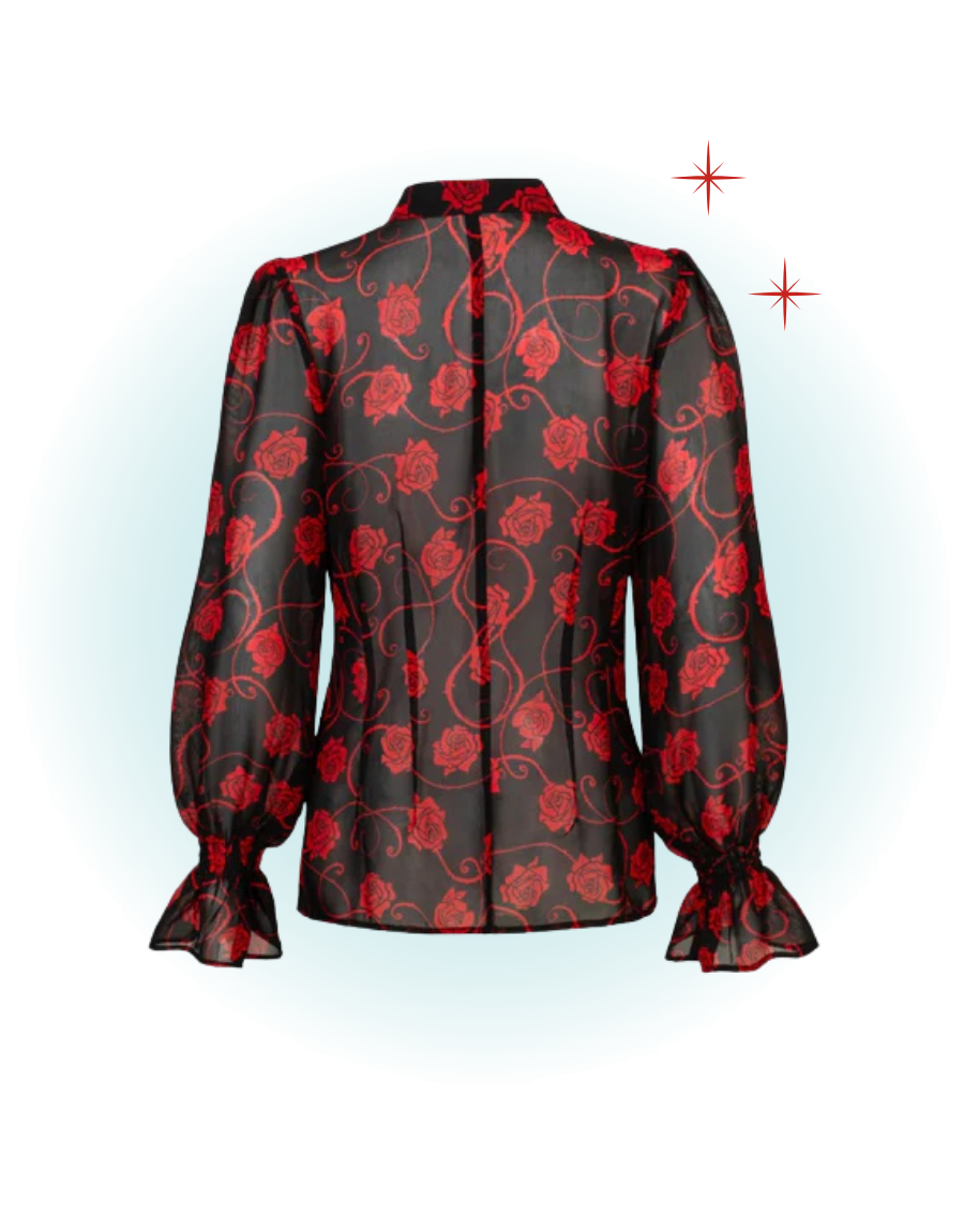 La blouse Thorn légèrement transparente avec un imprimé de roses rouges et lianes épineuses est une pièce unique qui ajoute une touche élégante à votre tenu du jour. Son col se termine par un grand nœud lavallière, tandis que les manches longues bouffantes finissent sur des poignets élastiqués et des volants pour un effet dramatique.