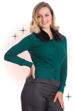 This green cardigan features adorable bow buttons and a faux fur collar. Add a vintage touch to your outfit with this adorable cardigan.