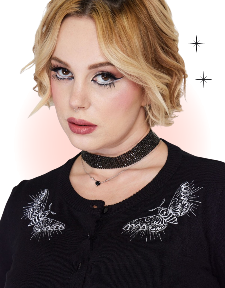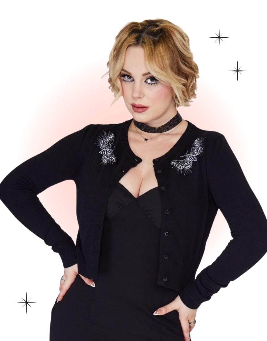 This black cardigan decorated with pretty moths is ideal for adding a little mysterious touch to your outfit.