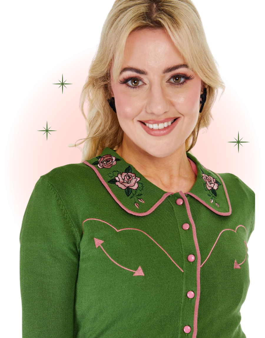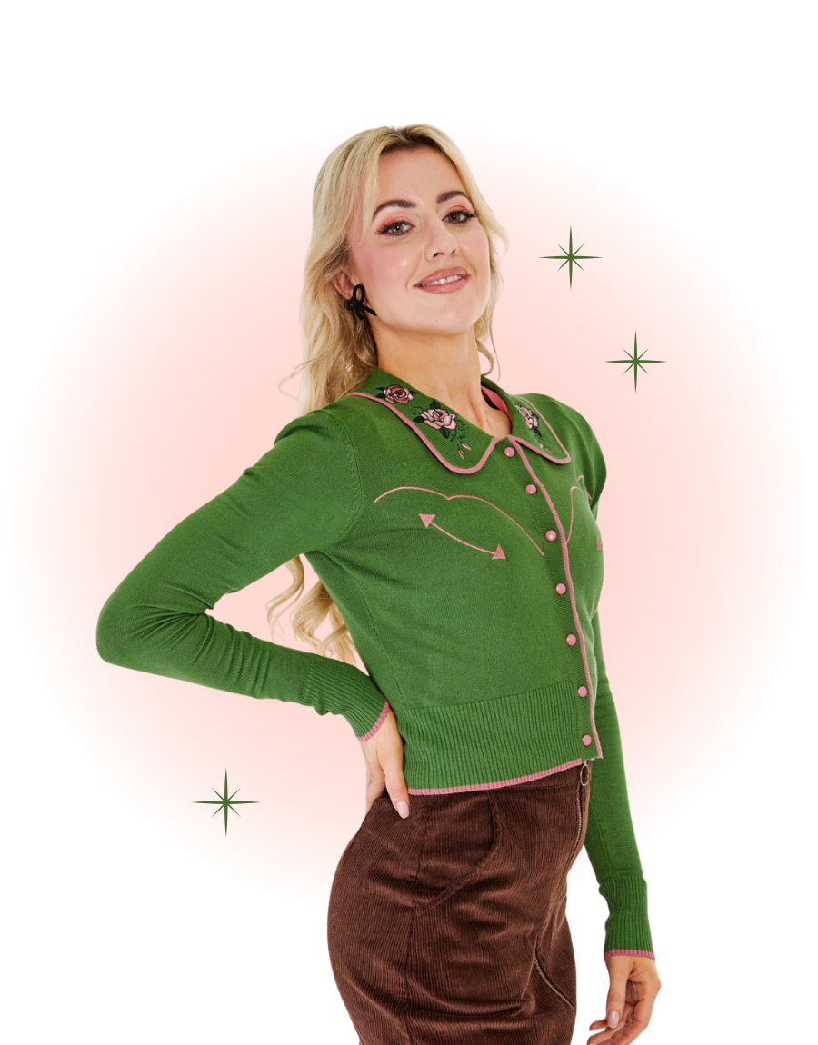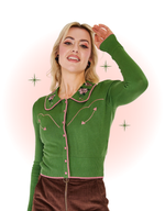 Romantic cowgirl looking for a cardigan to match? This little gem by Voodoo Vixen in bright green with pink details will turn heads. A retro touch, a touch of rebellion, and a whole lot of style. Wear it without moderation, with cowboy boots or pink lipstick.