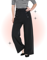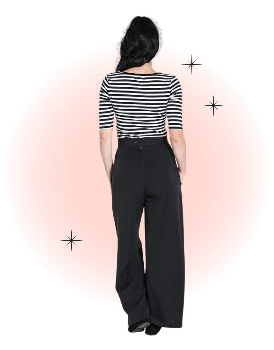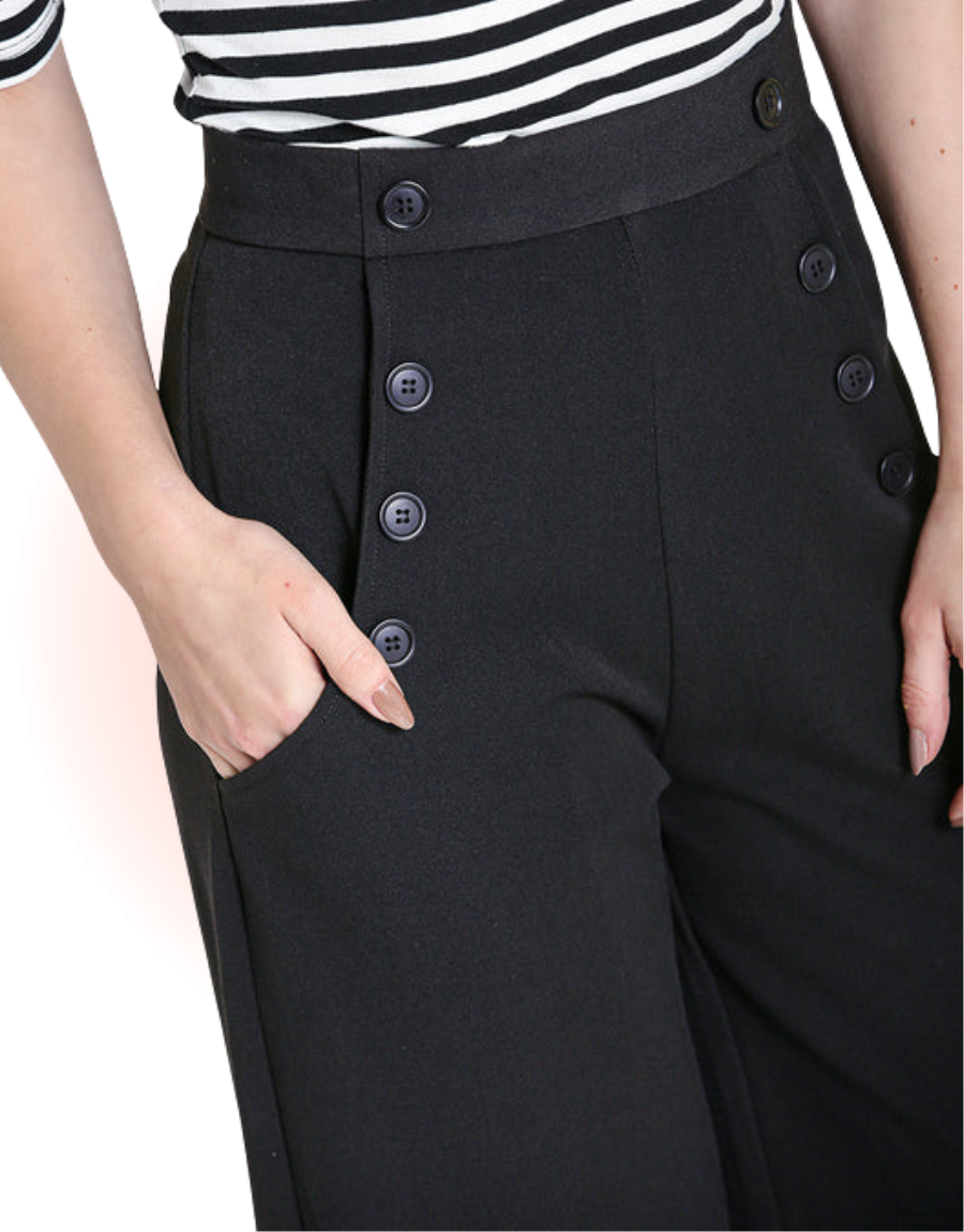 Looking for a pair of trousers to add to your everyday wardrobe? Look no further than our made in England Carlie Swing trousers. Their high waist and wide legs leave plenty of room for your hips and behind ;) The two large front pockets and decorative buttons add a business touch. The back zip closure gives a subtle look.