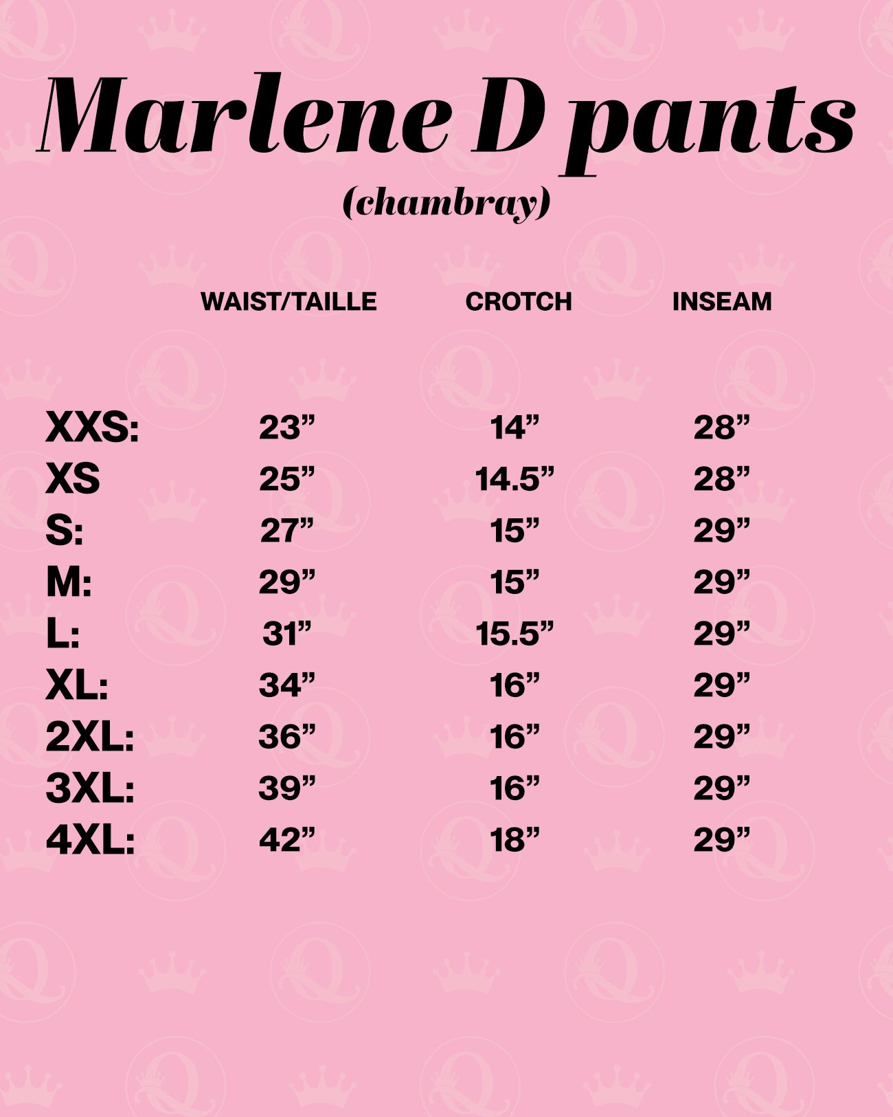 | Taille/Waist | Entrejambe/Crotch | Longueur/Length | |
