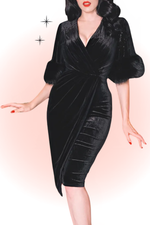 The 5th Avenue Dress in Black is an exquisite ode to 1940s glamour. It features flared sleeves with attached faux fur, a pleated V-neck bodice, and a faux wrap skirt (fixed waist) with belt. All in a comfortable stretch velvet that hugs your curves. This comfortable piece will have you feeling as good as you look!