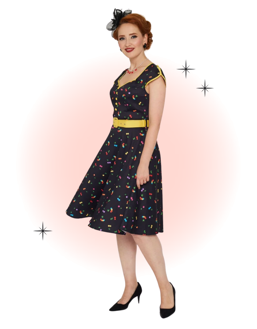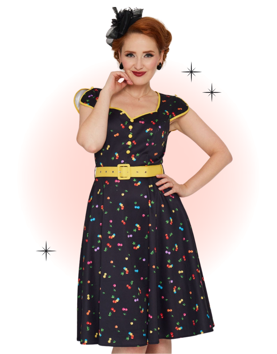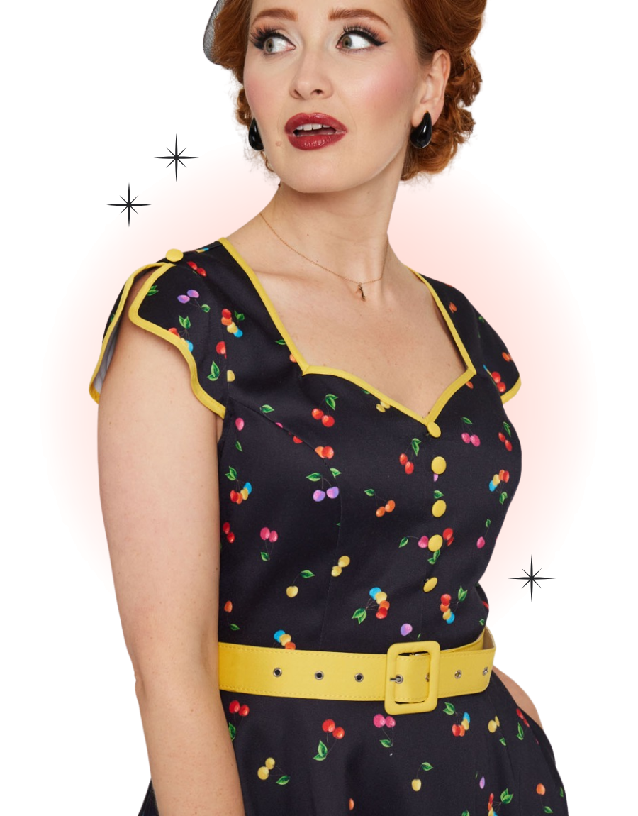 This vintage-style rainbow cherry flared dress is black, with a contrasting yellow belt, sleeve cuffs, and collar. Its pretty slit sleeves and decorative buttons on the front give it undeniable charm.