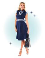 The Bonny navy flared dress is chic and a must-have for a retro nautical-inspired look. With its buttoned sleeves, bow at the neck, and pretty belt, it's sure to please!