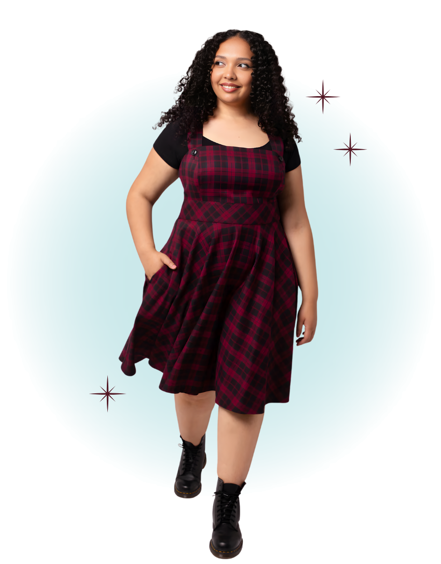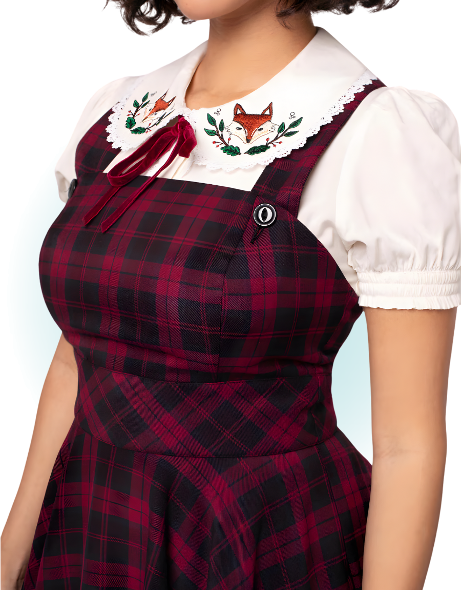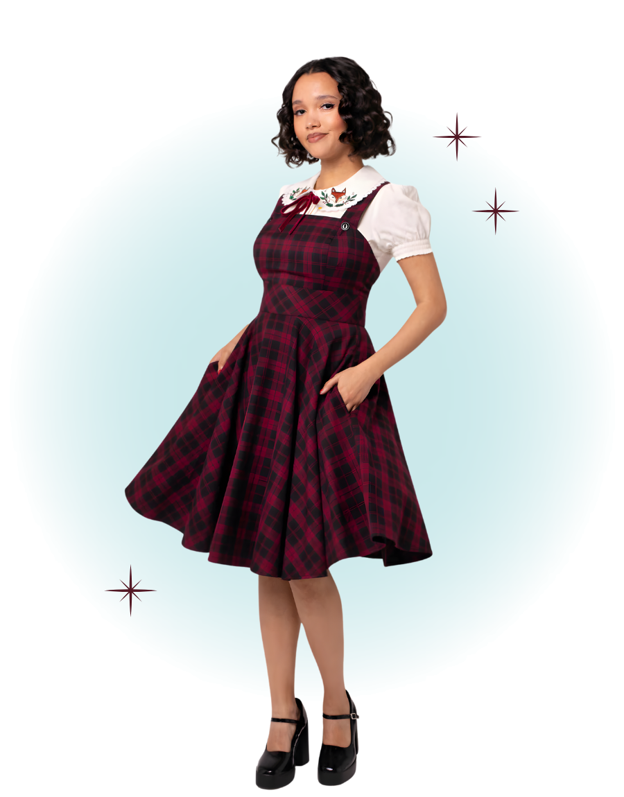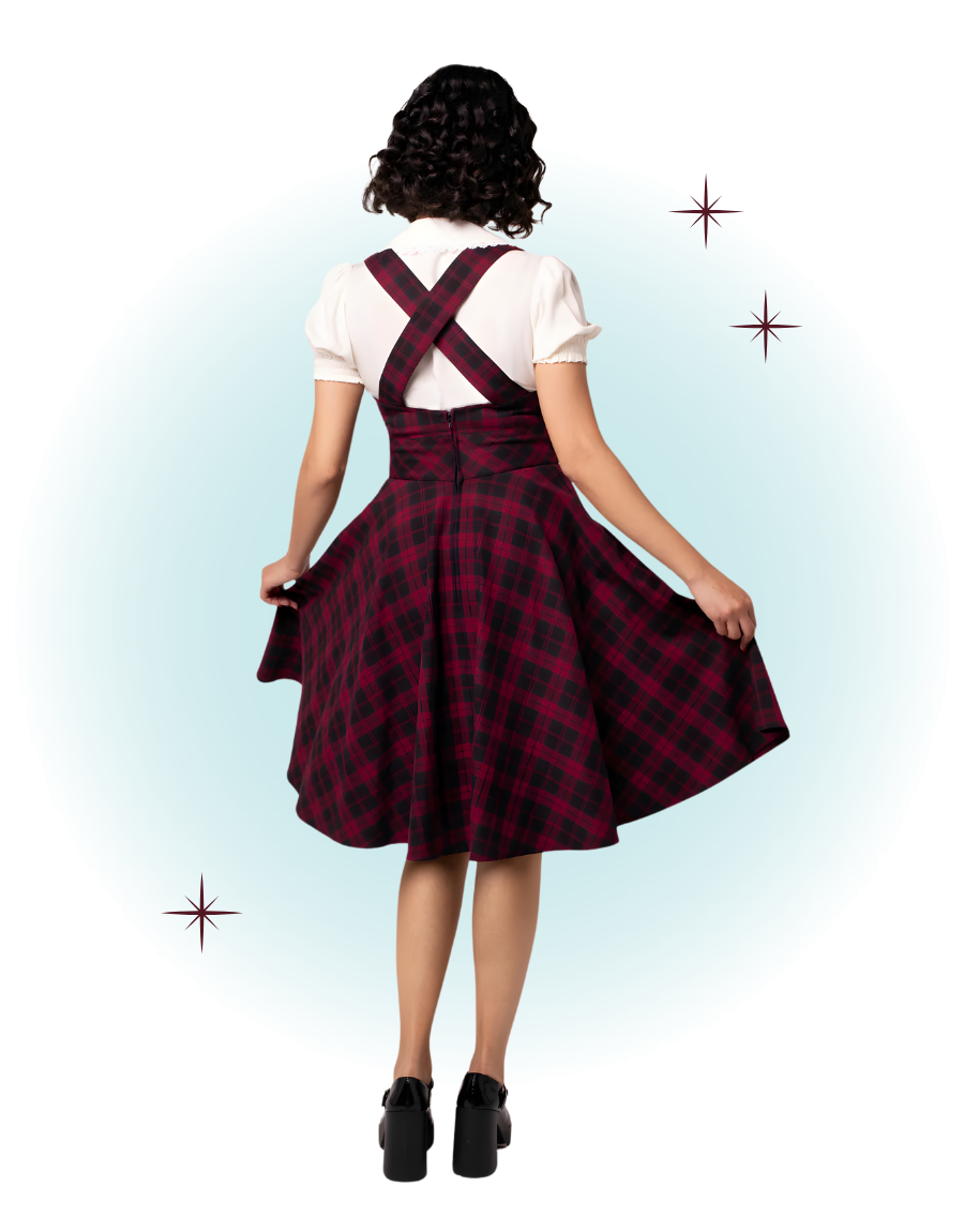 The Carmina Pinaforme dress is fitted at the bust and has adjustable straps adorned with black buttons. The waist is cinched and the skirt is flared.