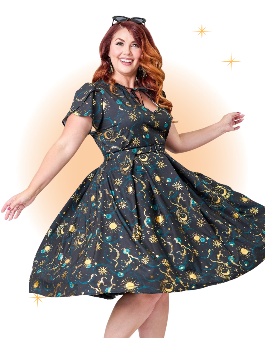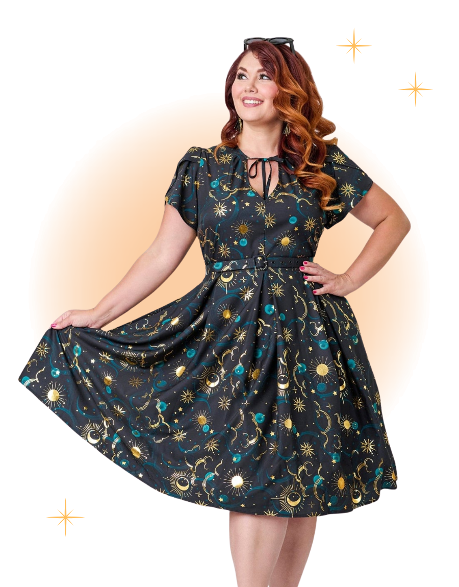 This 1940s-style A-line dress is crafted from a lightweight fabric featuring a stunning gold celestial print on a black background. The bodice features a keyhole front tie detail, framed by petal sleeves, while the waistband hugs the figure.