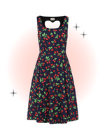 This 50s-style navy dress with red and white cherries is a real favorite for a chic and playful look. Its open back adds an irresistible retro elegance. This dress is perfect for any evening or casual outing!