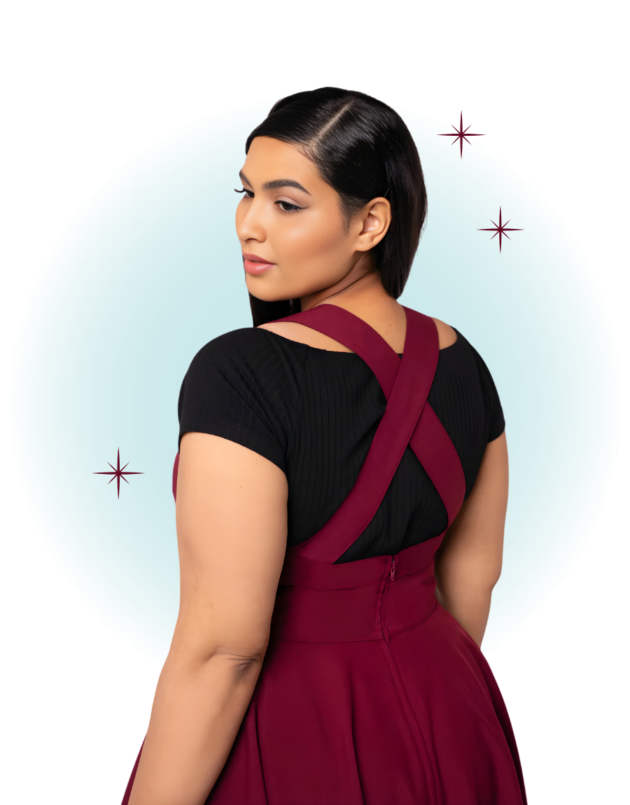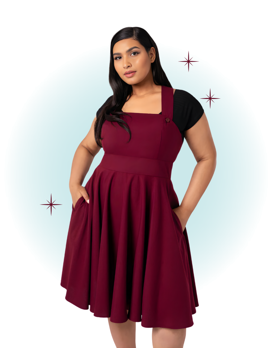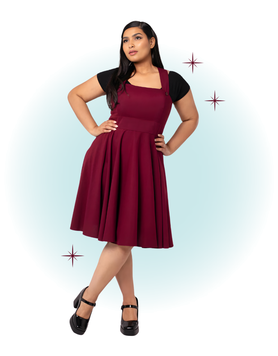 This cute burgundy Patti Pinafore dress is a versatile piece that can be worn for any occasion with a sweater, t-shirt, or blouse underneath. Its fabric and flattering cut promise all-day or evening comfort.