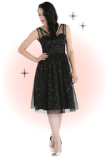 Make your evening shine with the black Infinity 50's dress! Its chic V-neck and flared skirt will give you a star look, while the little golden stars and moons add a magical touch. Perfect for galas, parties and unforgettable moments, this dress guarantees you an evening in the spotlight!