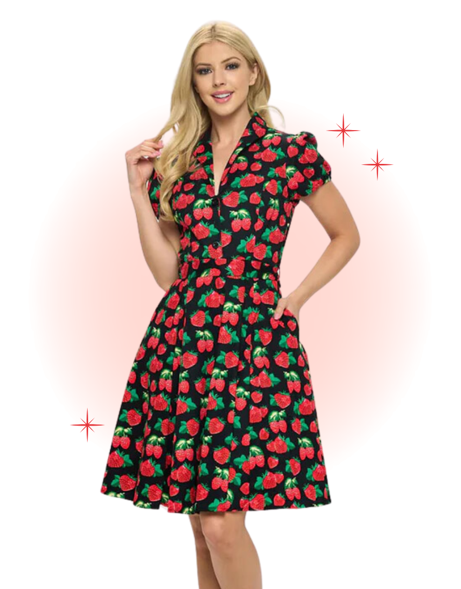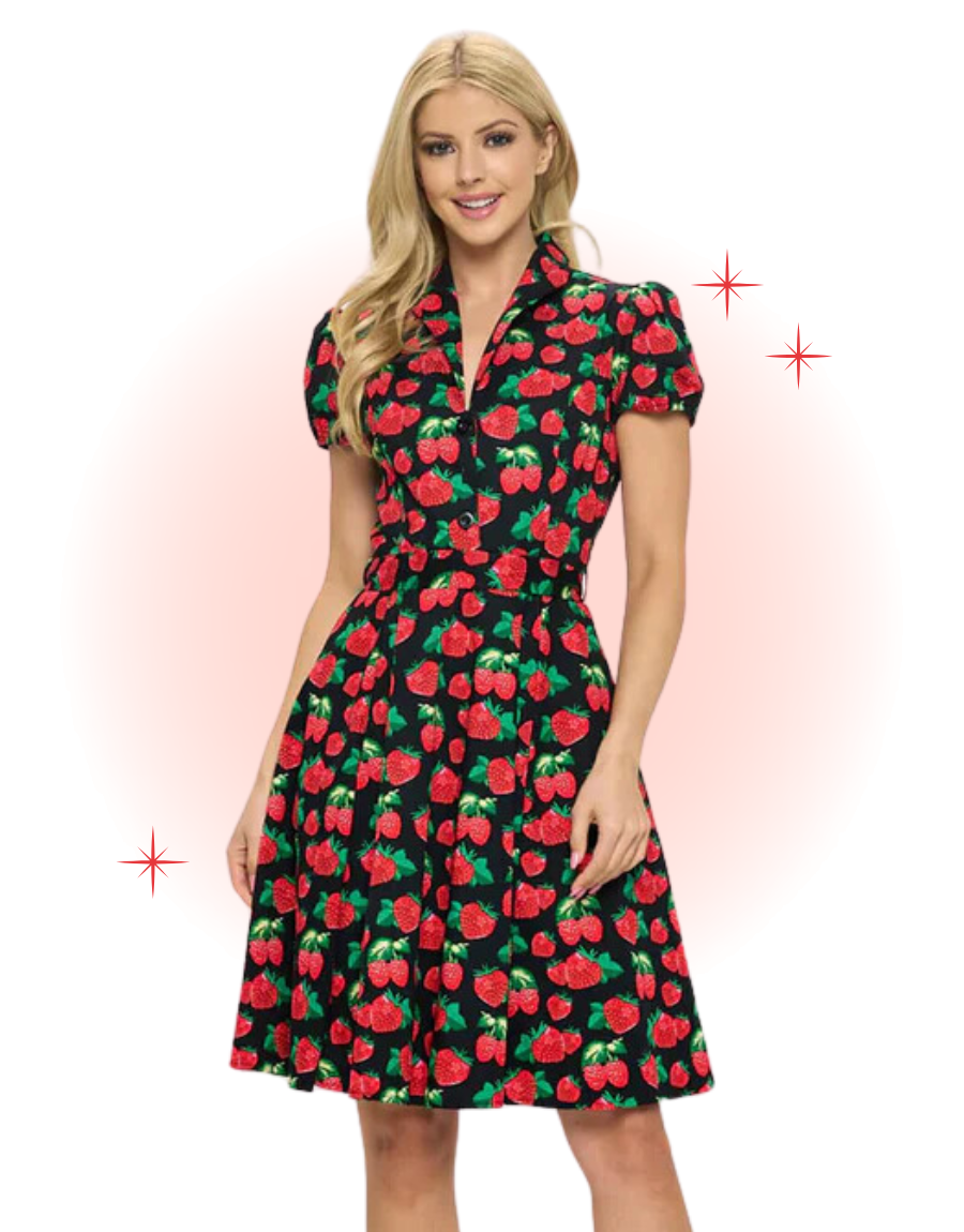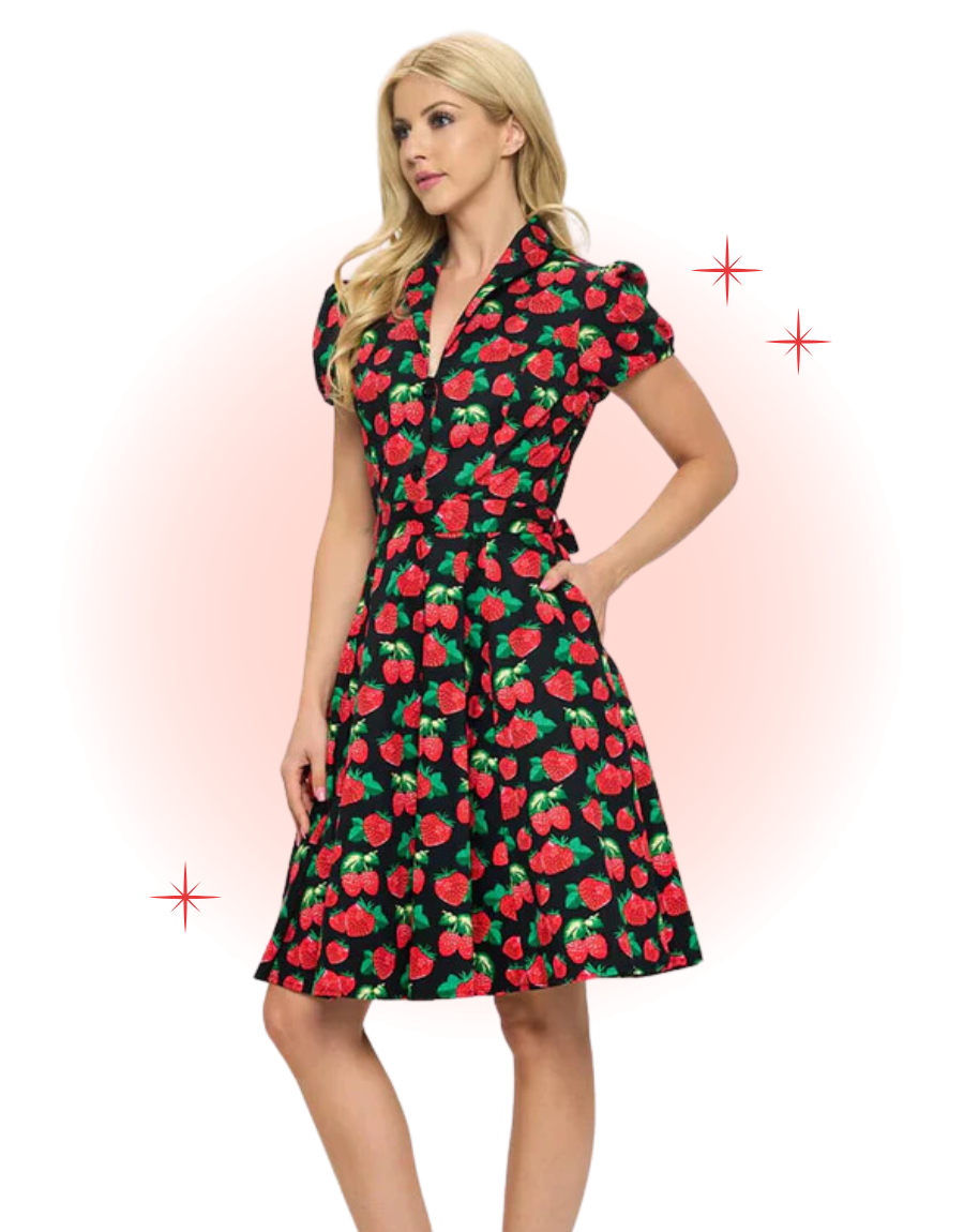 This strawberry and raspberry print flared dress will charm you. With its puffed sleeves, belt, and semi-circular skirt, it's perfect for any occasion. You can wear it on a hot summer day, for a picnic, or simply to go dancing—you'll turn heads!