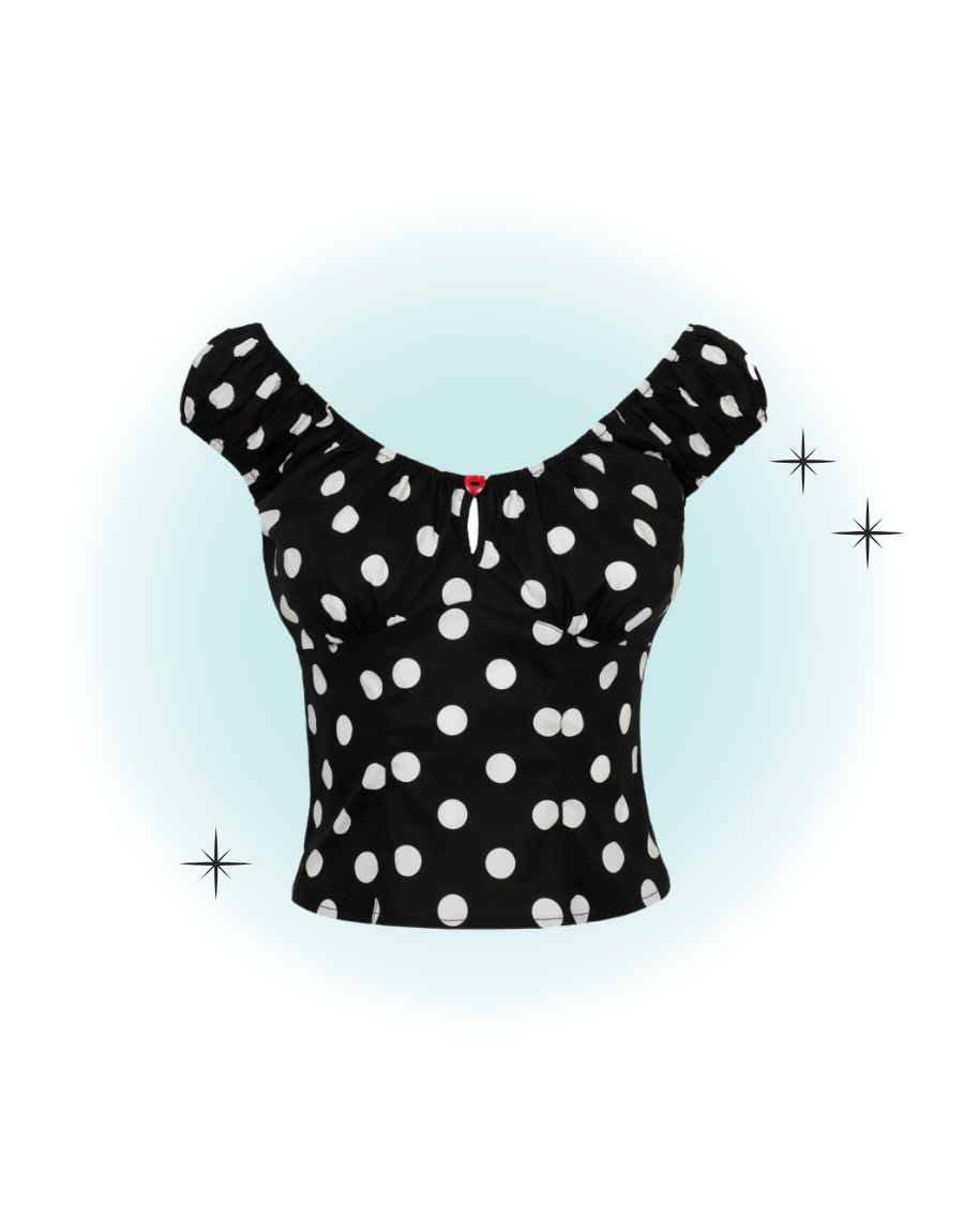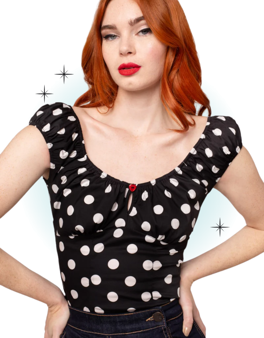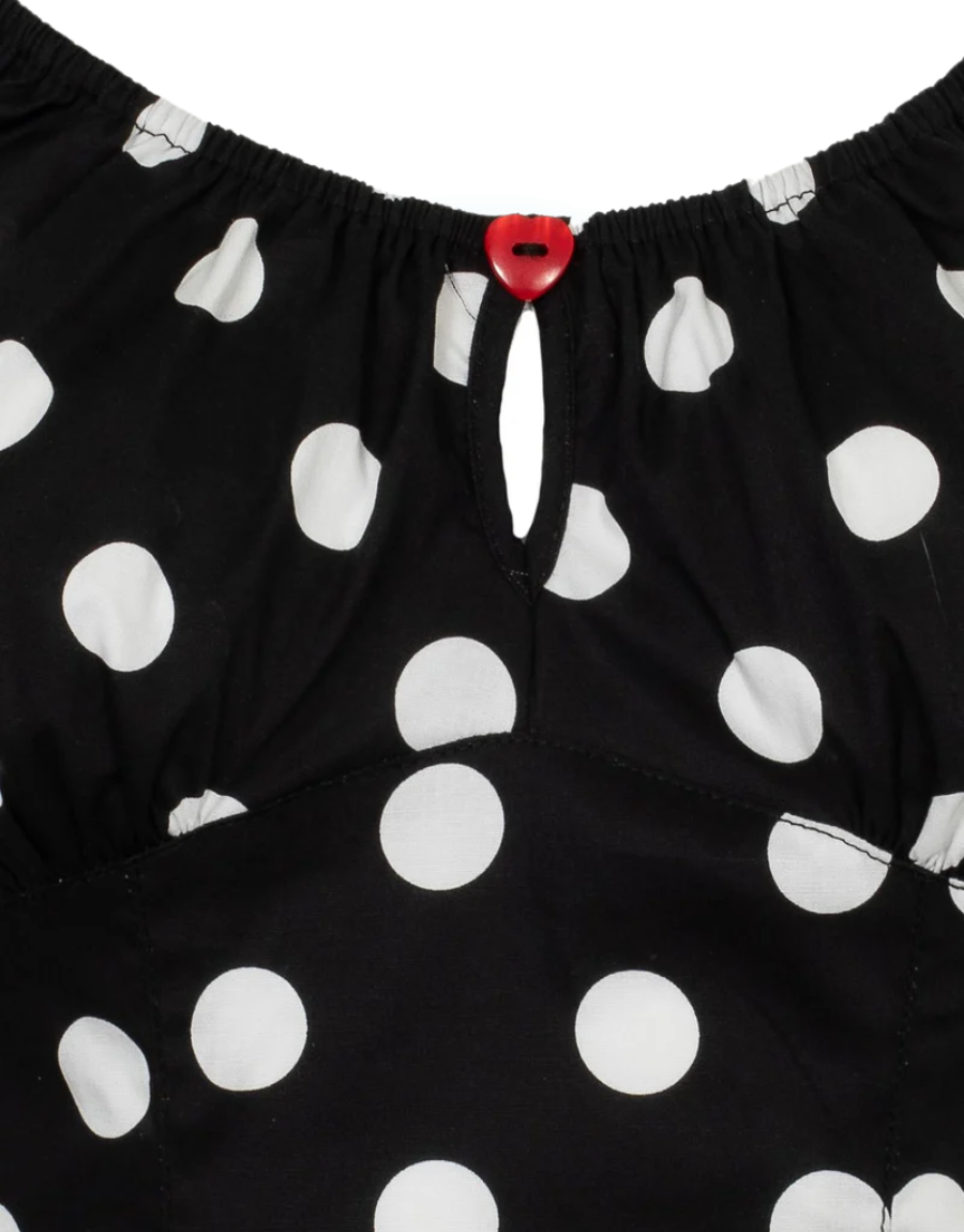 The black Domino top embodies vintage glamour, perfect for any occasion. This fitted, retro-style top features a large white polka dot print and elasticated sleeves and a collar. A circular peekaboo-style opening is attached with a red heart button at the center of the neckline.