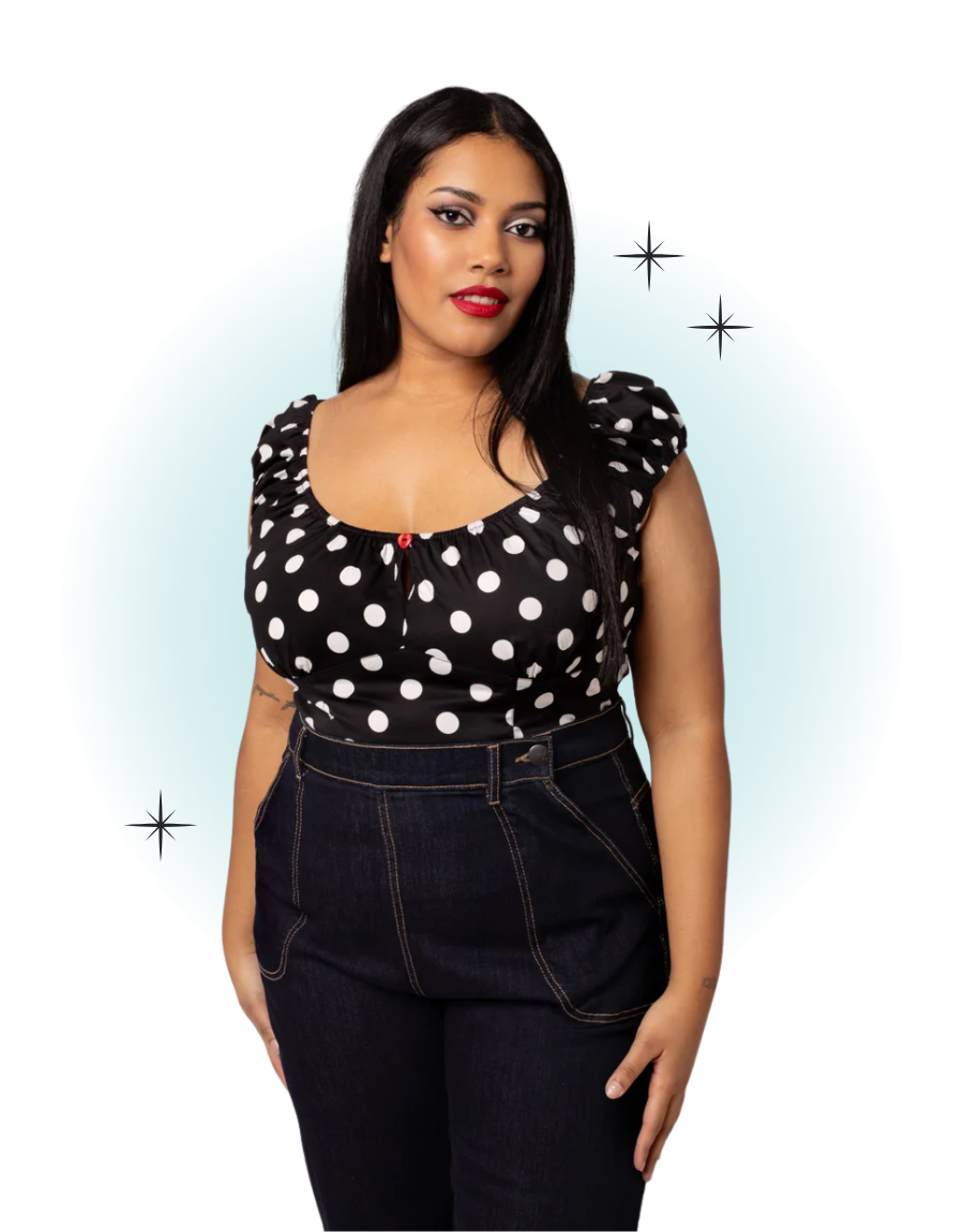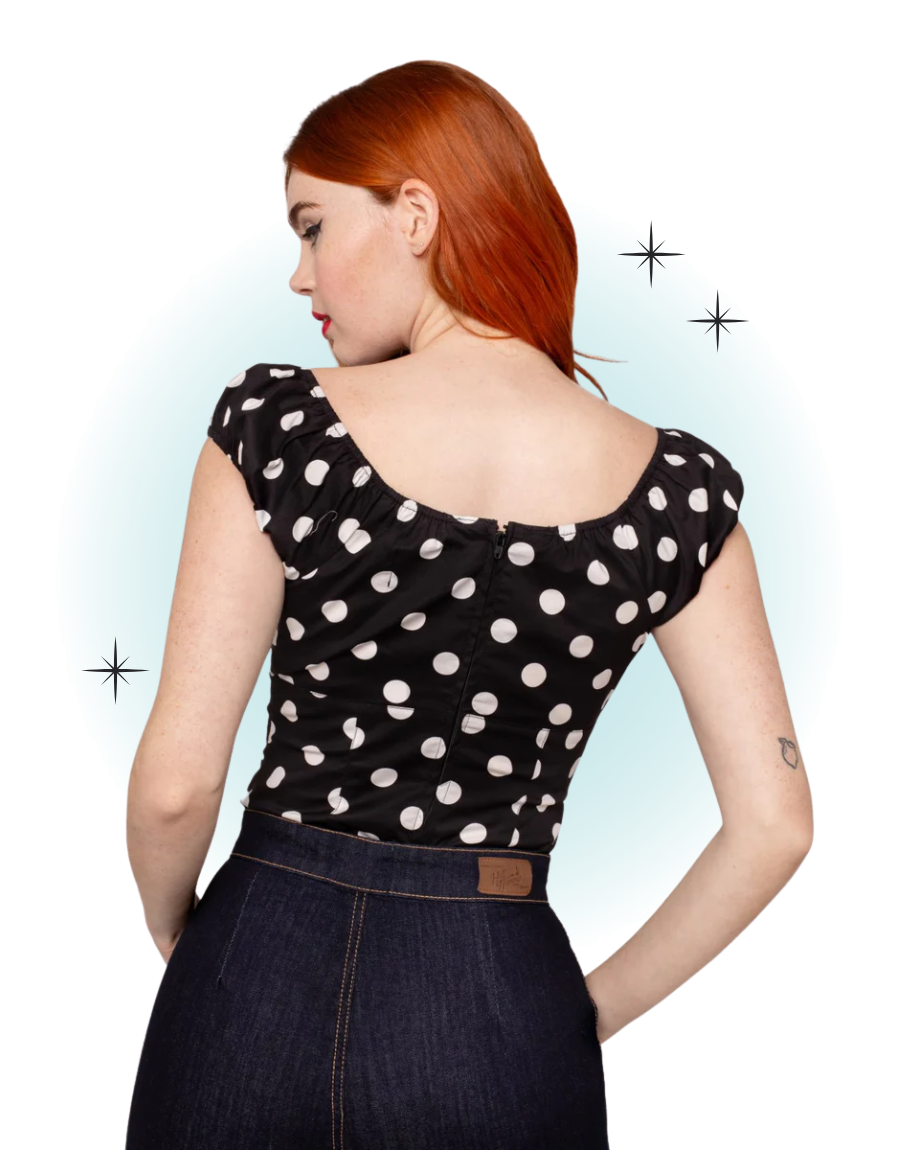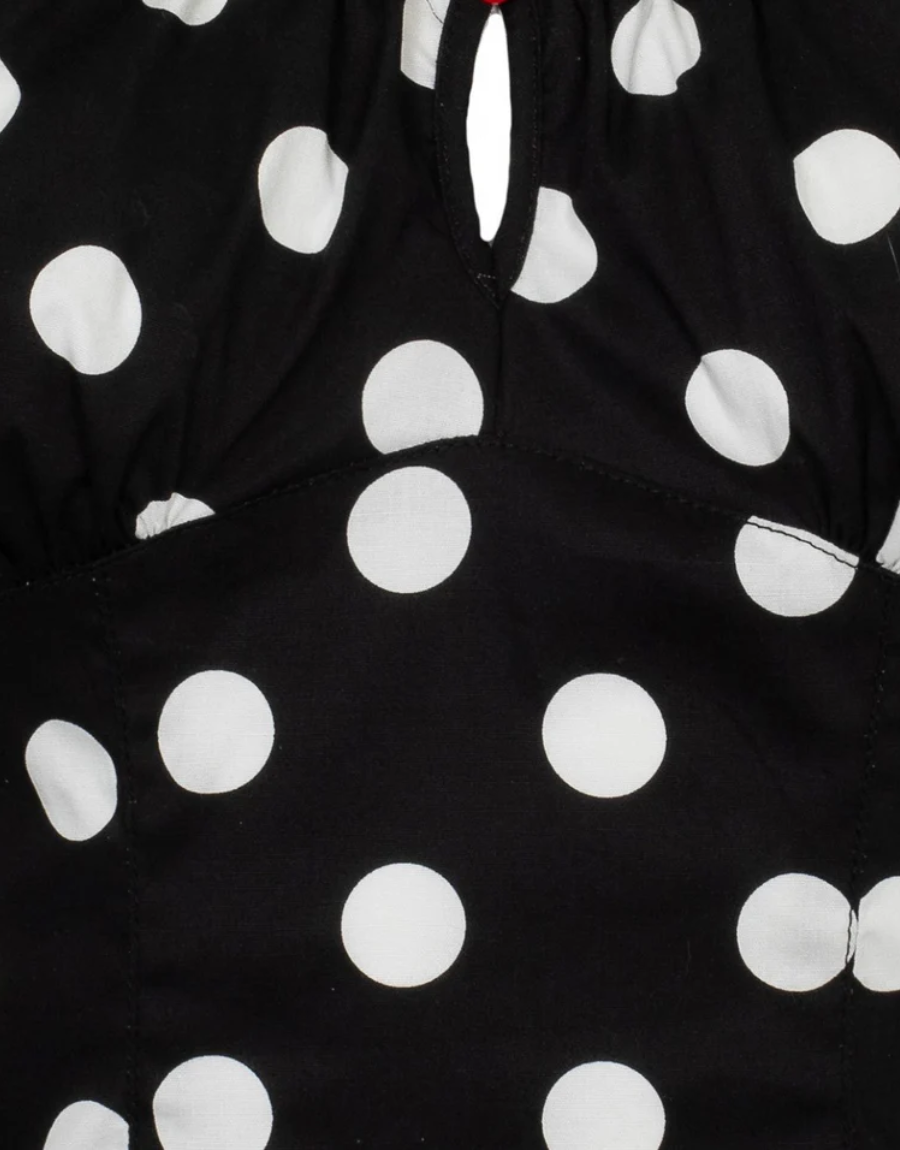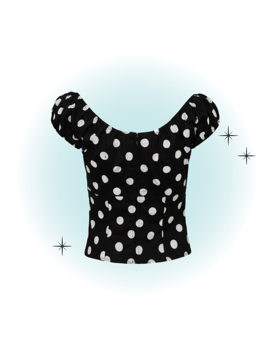 The black Domino top embodies vintage glamour, perfect for any occasion. This fitted, retro-style top features a large white polka dot print and elasticated sleeves and a collar. A circular peekaboo-style opening is attached with a red heart button at the center of the neckline.