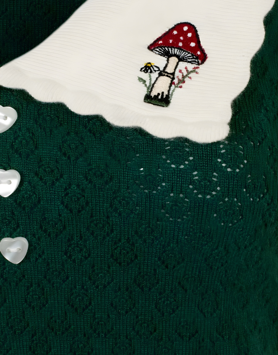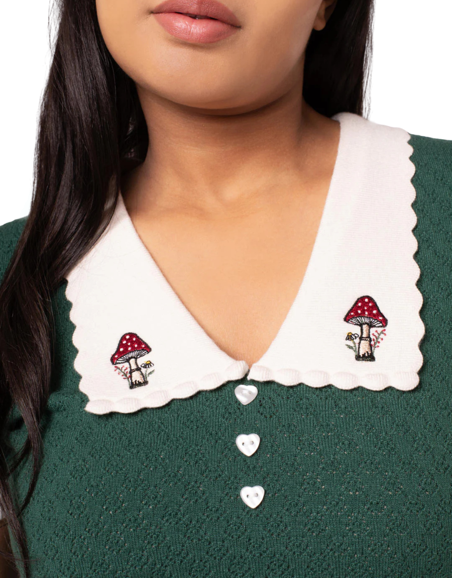 Hell Bunny's Geneviève green top captivates with its delicate neckline, mushroom embroidery, and emerald hue. Worn with a pencil skirt or high-waisted trousers, it creates an elegant and feminine look, perfect for both everyday wear and special occasions.