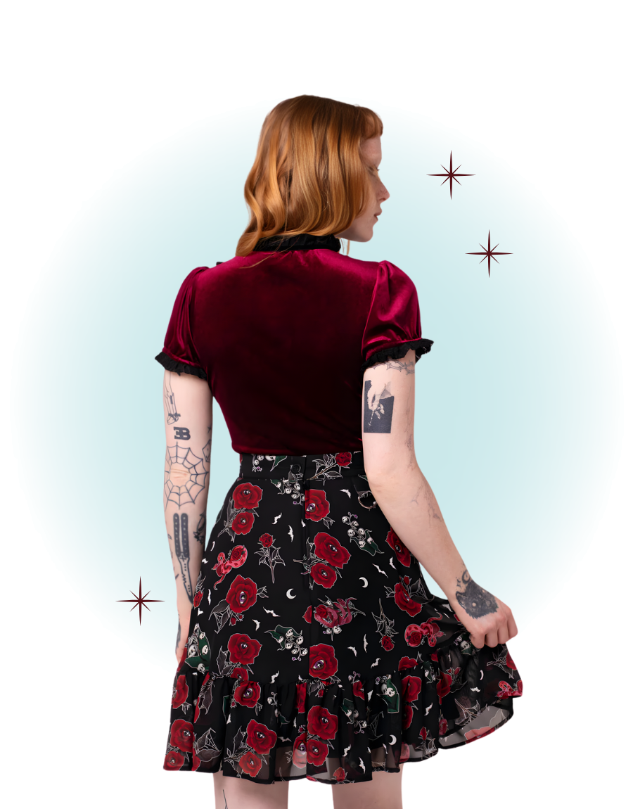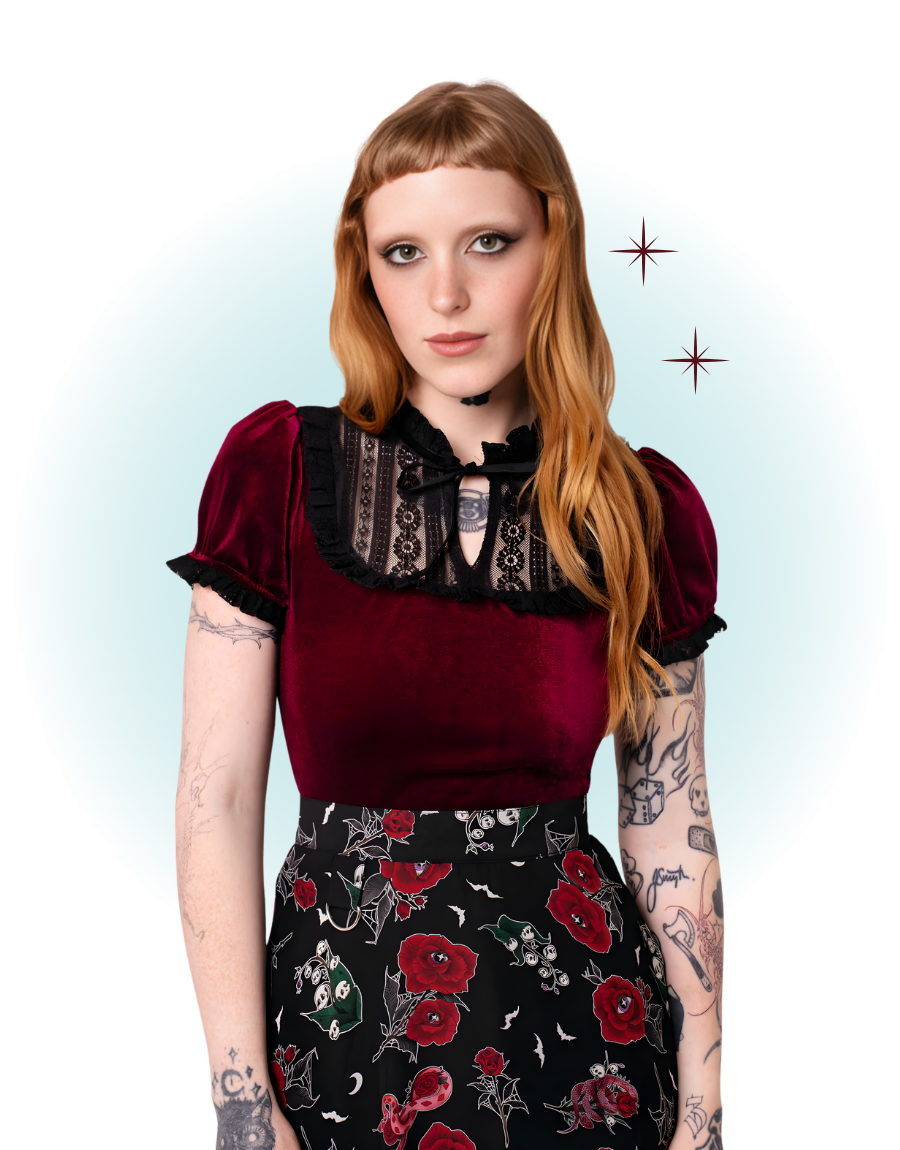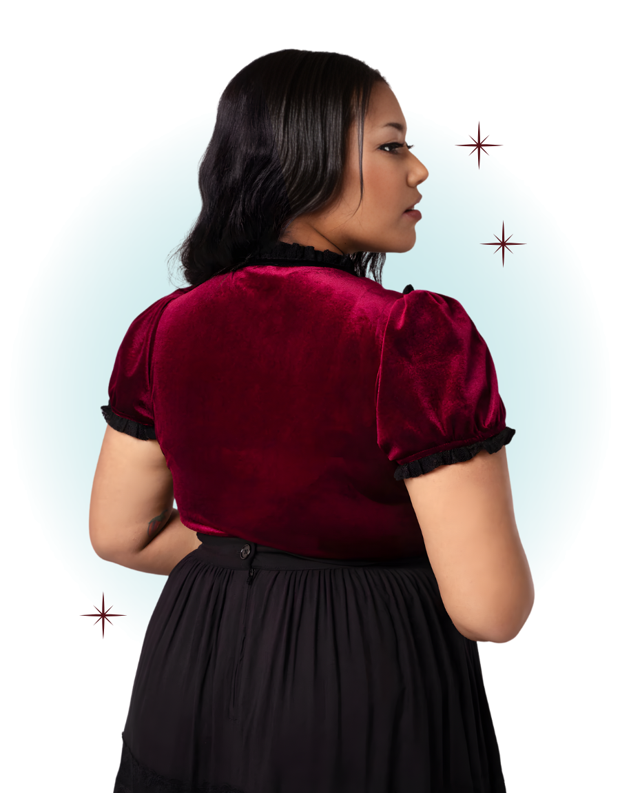 Le top Mourning bourgogne en velour mise sur une allure glamour et mystérieuse, avec une coupe flatteuse et un charme rétro irrésistible. Elle se porte aussi bien en soirée qu’au quotidien pour une touche d'élégance.