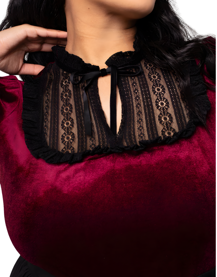 - Manches : manches courtes avec finitions de dentelle noire et ruban de velours noir