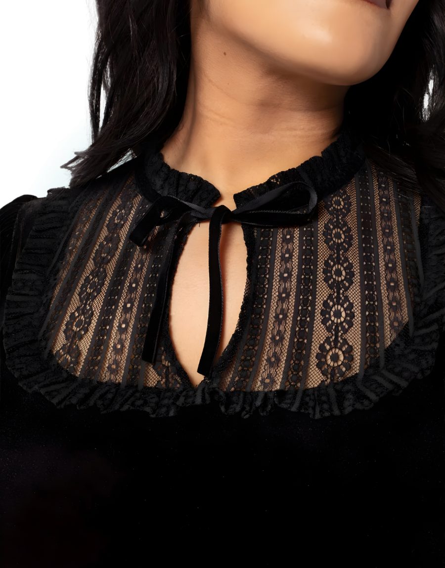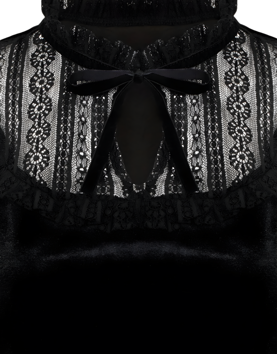 Motifs : col noir en dentelle qui descend au niveau du buste