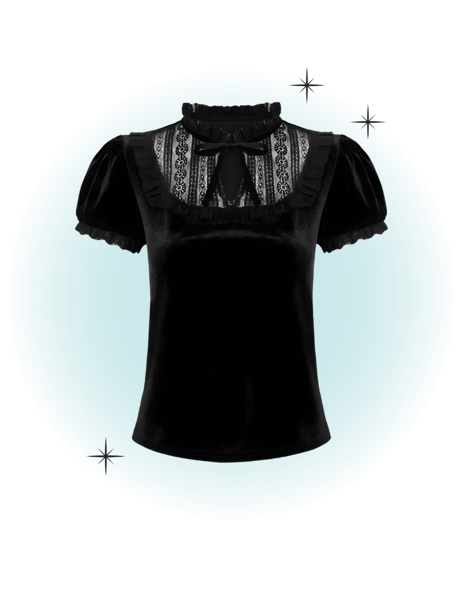 - Manches : manches courtes avec finitions de dentelle noire et ruban de velours noir