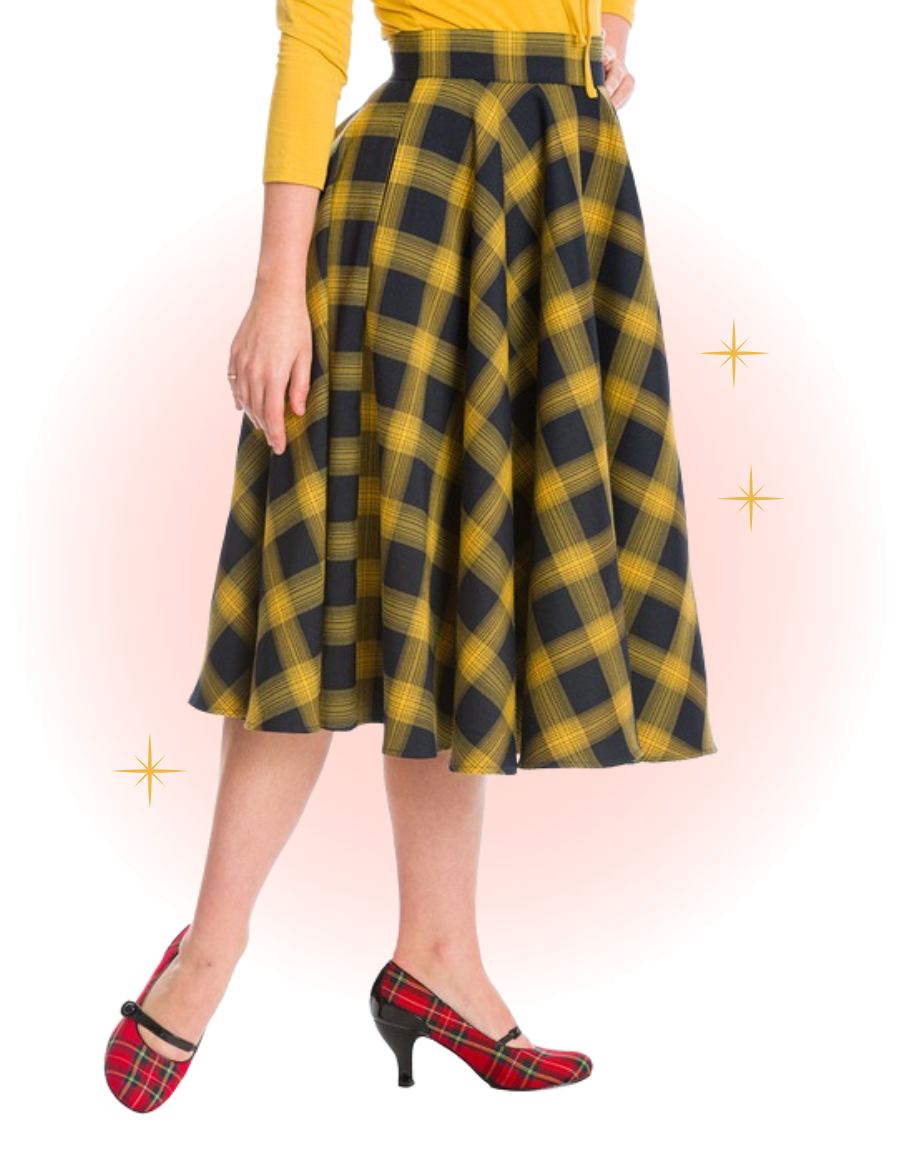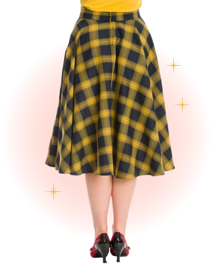 Haga un viaje en el tiempo a los fabulosos años 50 con la falda con vuelo Sweet Check Retro de Banned. Transpórtate a la era del encanto del rockabilly y abraza la moda atemporal con esta pieza cautivadora. Disponible en un vibrante tono tartán amarillo, esta falda es una verdadera oda al estilo vintage.