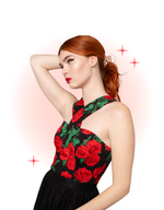 Le top Dolce Vita est un top à col halter romantique d’inspiration vintage qui ne manquera pas de faire fondre votre cœur. Il est fabriqué dans un coton confortable, avec un imprimé de roses rouges luxuriantes dispersées sur une base noire. Sa forme ajustée est rehaussée de découpes princesse qui épousent le corps pour une silhouette flatteuse.
