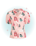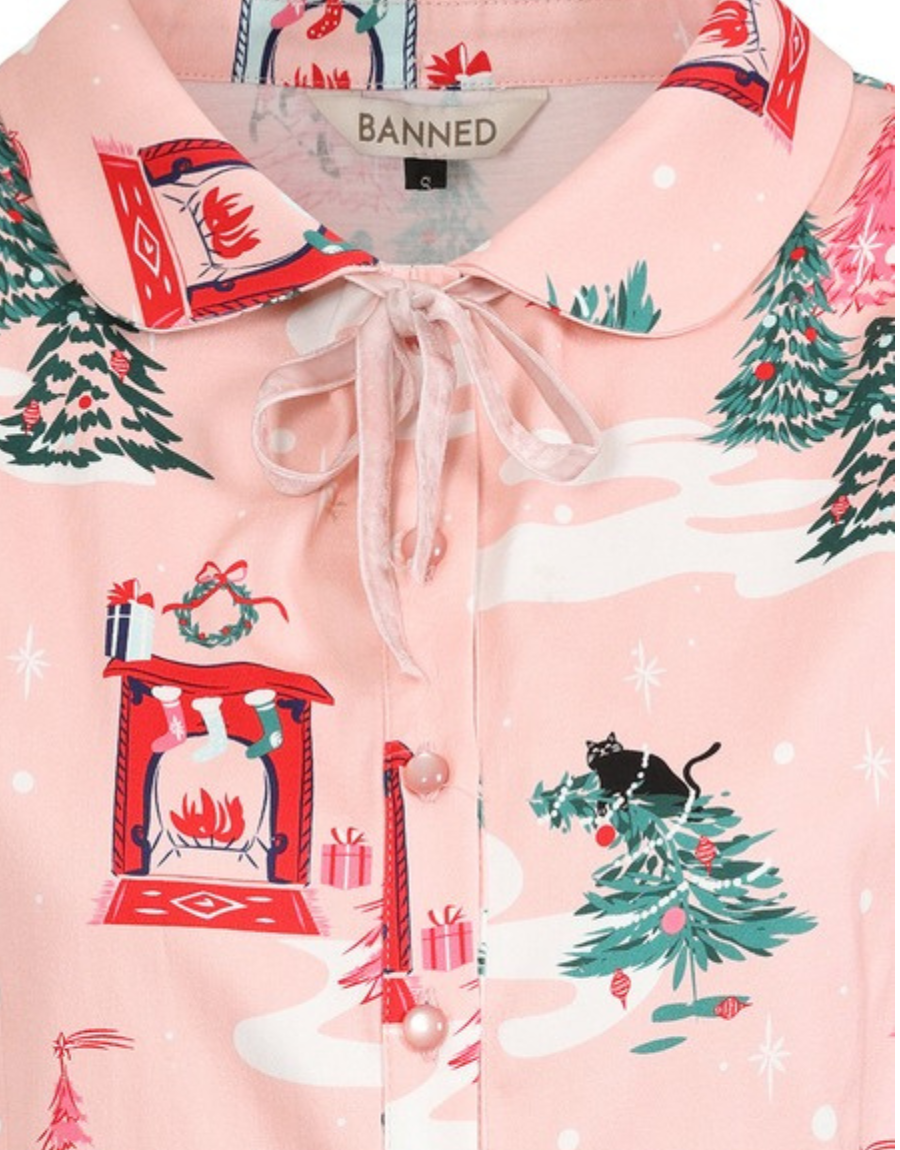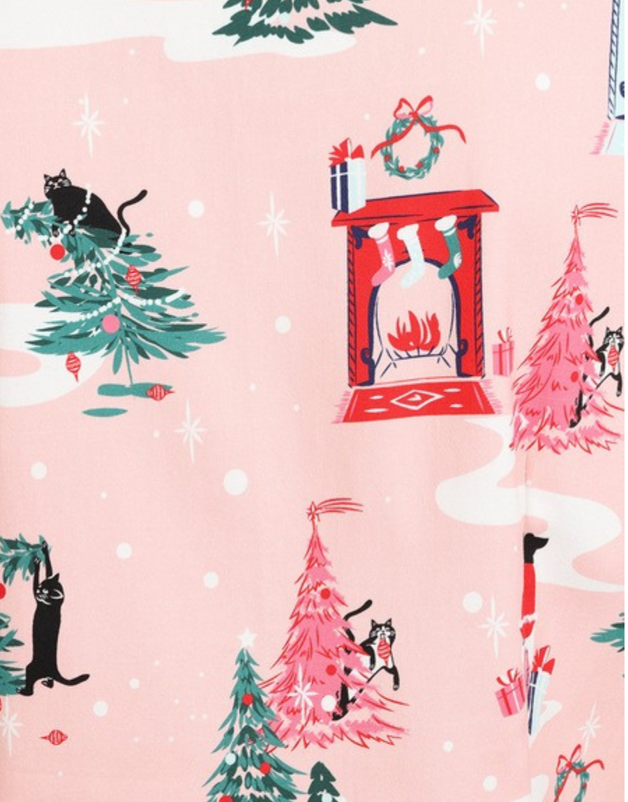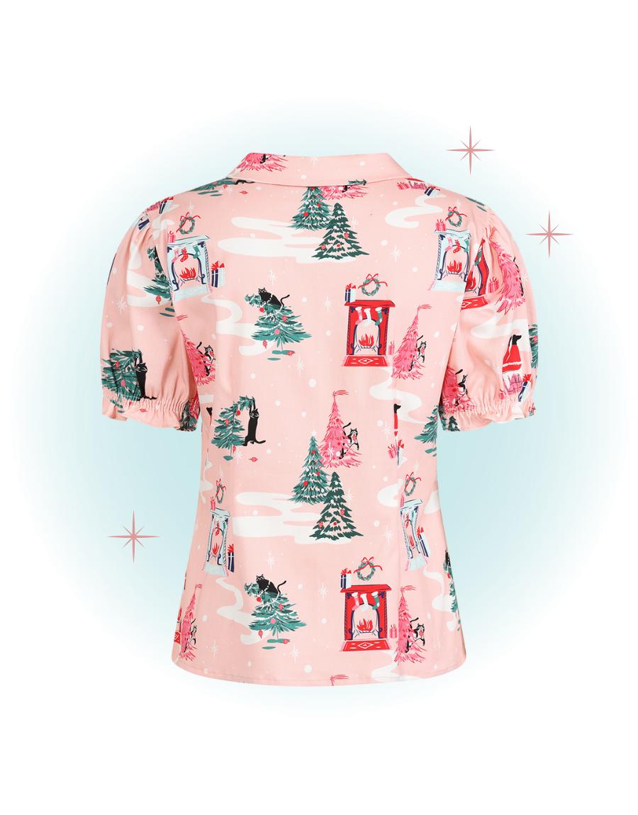 Blouse manches courtes pastel rose avec imprimée de chats jouant dans les sapins de Noel, de père Noel et de feu de foyer. Elle est agrémenté d'un petit noeud en velour au col.