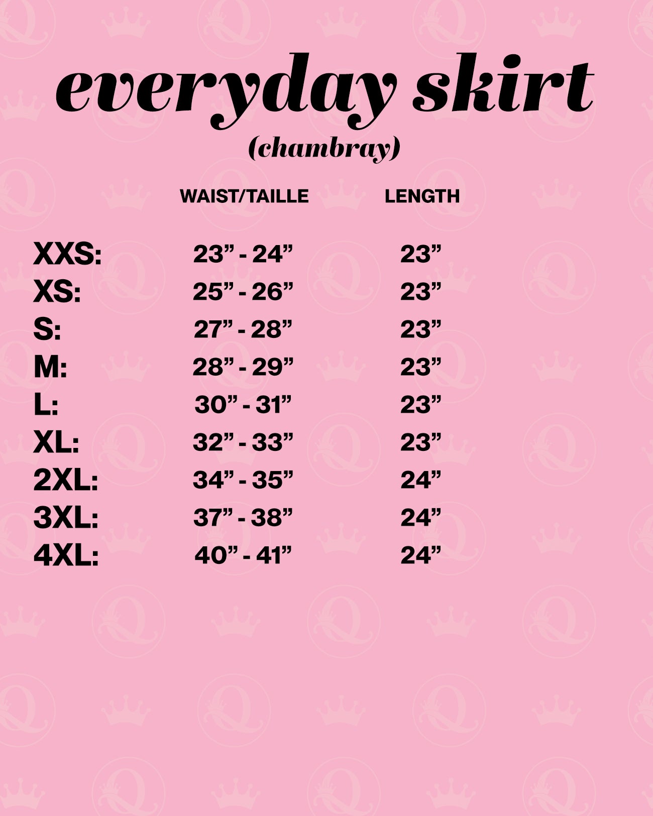 Faites revivre les belles années avec la jupe évasée Everyday 50s. Dotée de poches et conçue pour le quotidien, elle allie confort, style et fabrication fièrement québécoise. Son tissu autant structuré que malléable évoque le volume d'une crinoline sans sacrifier le confort. Sa teinte bleu chambray ajoute une touche lumineuse à vos tenues. Disponible en taille plus. Série limitée – ne la manquez pas Qualités du vêtement :