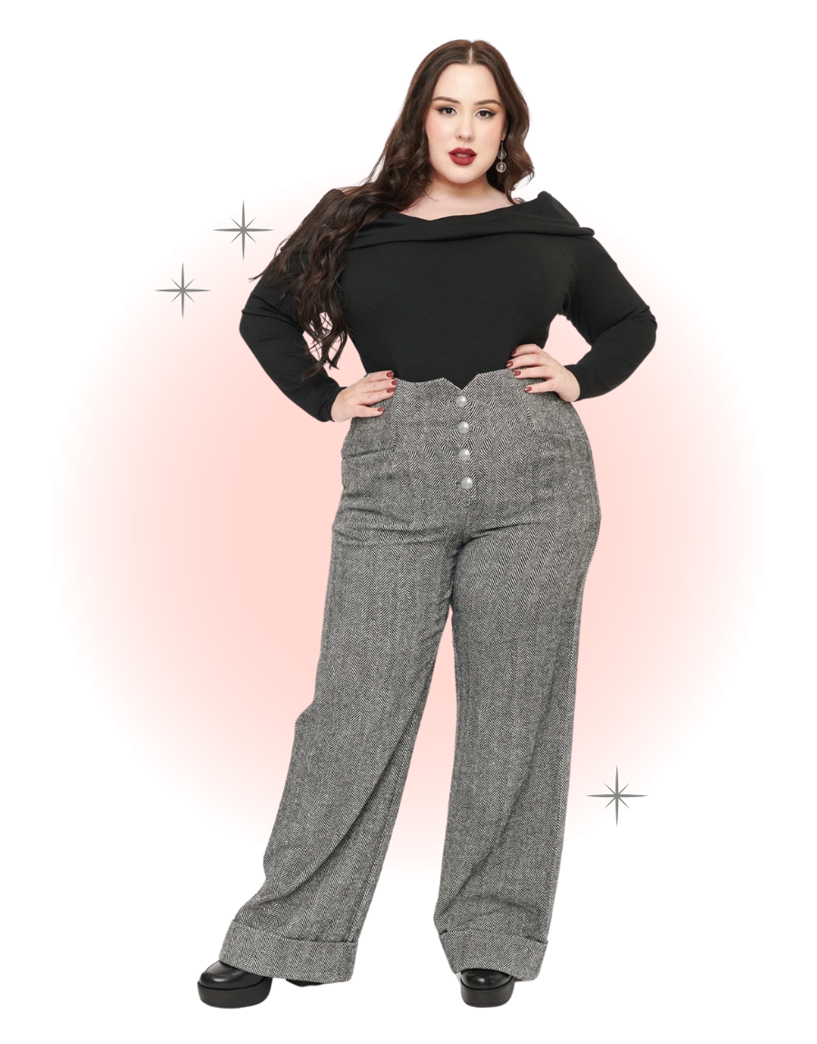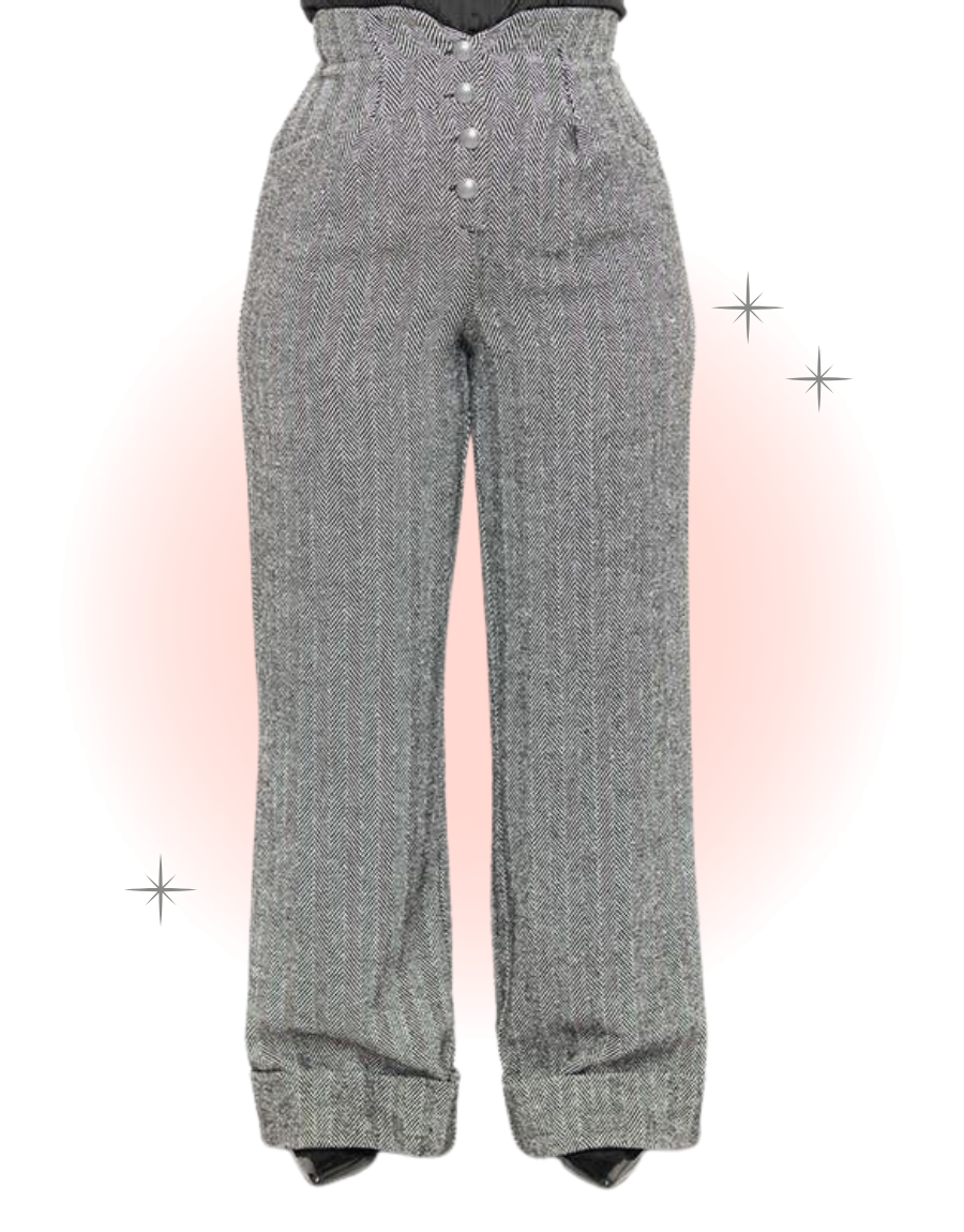 Le pantalon Herringbone gris d’inspiration années 1940 a une belle silhouette de jambe large tissée à chevrons gris. Équipé d’un bouton exposé et de poches à l’avant.