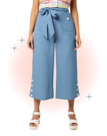 Le pantalon Rylee bleu à jambes larges a une ceinture assortie attachée en boucle à la taille. L’avant est doté de 2 poches plaquées, rehaussées de surpiqûres contrastées et de boutons blanc nacré. Les surpiqûres assorties et les boutons décorent les côtés de chaque jambe pour une touche finale chic.