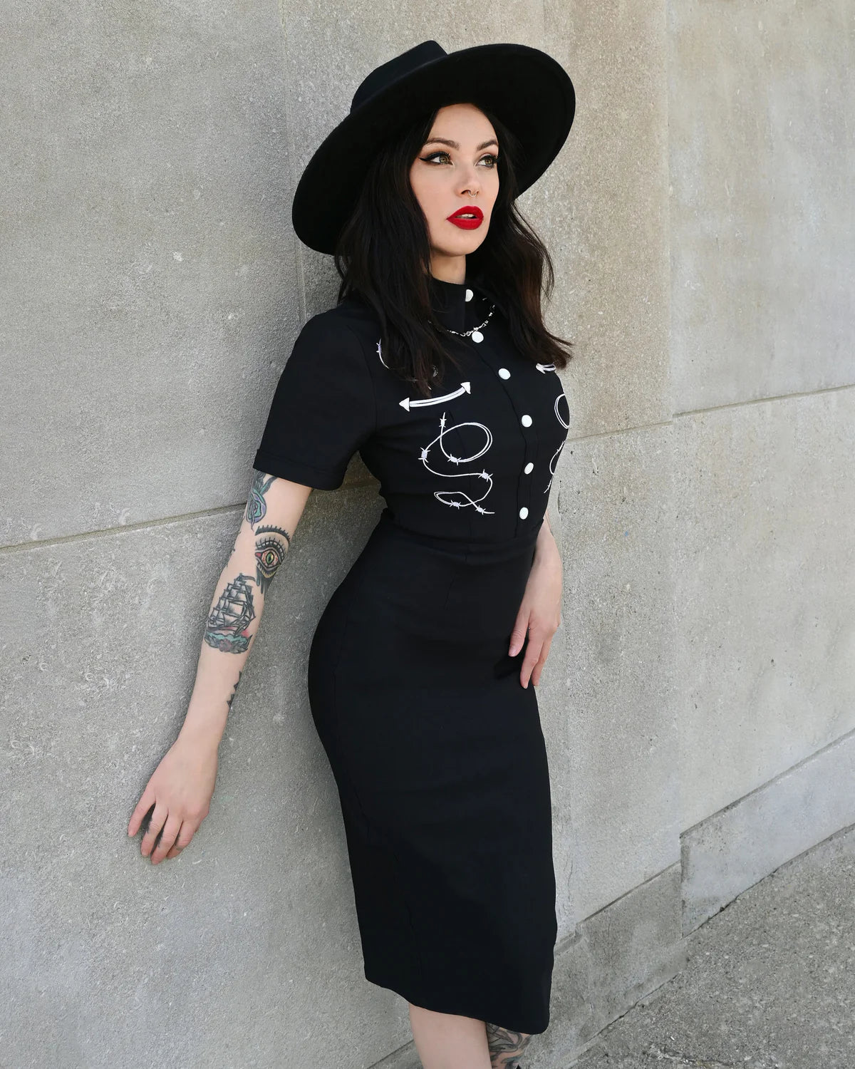 La robe Barbara est un rêve western qui épouse les courbes, avec ses broderies personnalisées en fil de fer barbelé et ses subtils détails passepoilés. Confectionnée en bengaline très extensible pour une coupe structurée mais souple. Les boutons-pression décoratifs sur le devant lui confèrent un look classique, tandis que la fermeture éclair dissimulée dans le dos permet de l'enfiler facilement.