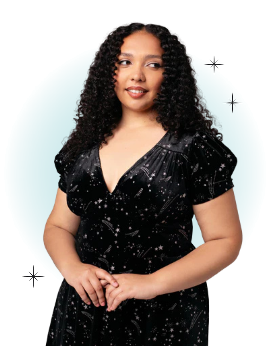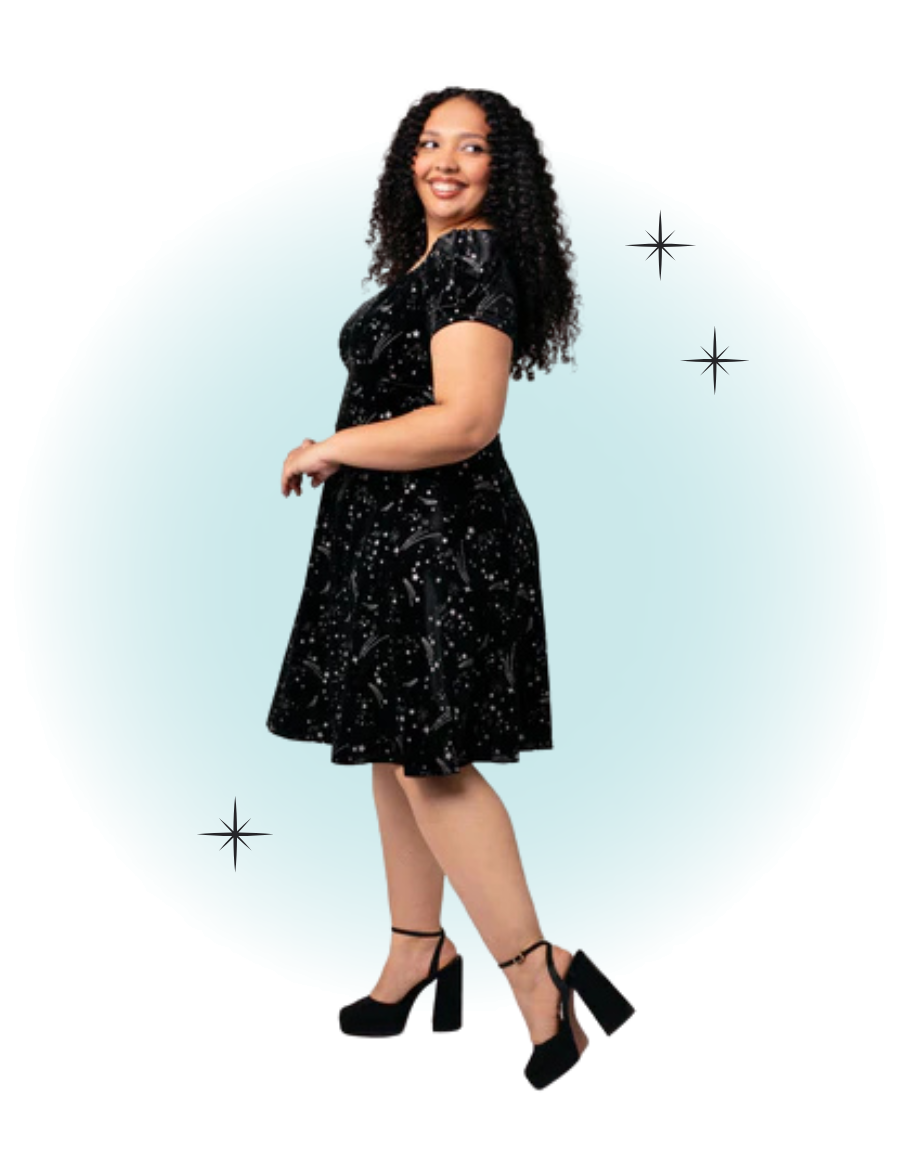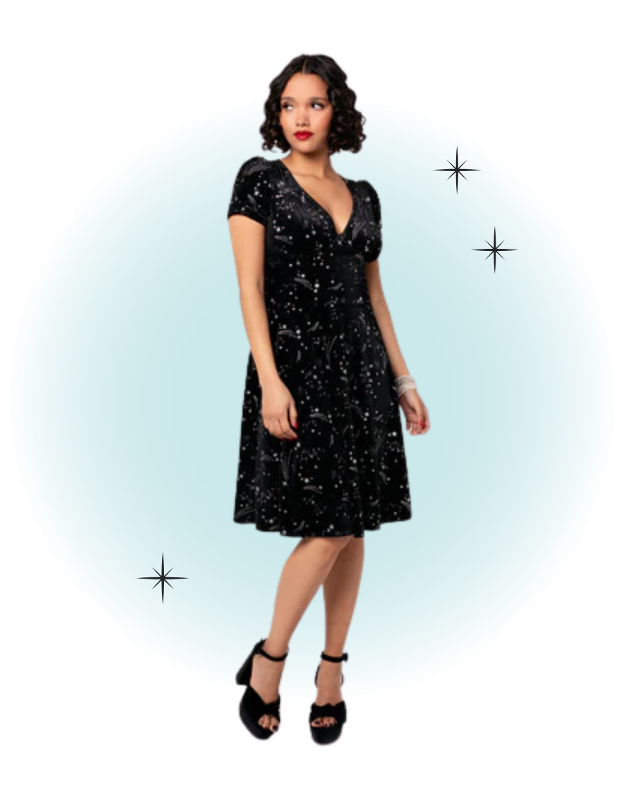 Envolez-vous au milieu des galaxies grâce à la robe Cosmic Dust Noire et soyez la star de la soirée. Cette magnifique robe en velours noir et au décolleté charmant est aussi confortable que magnifique.