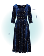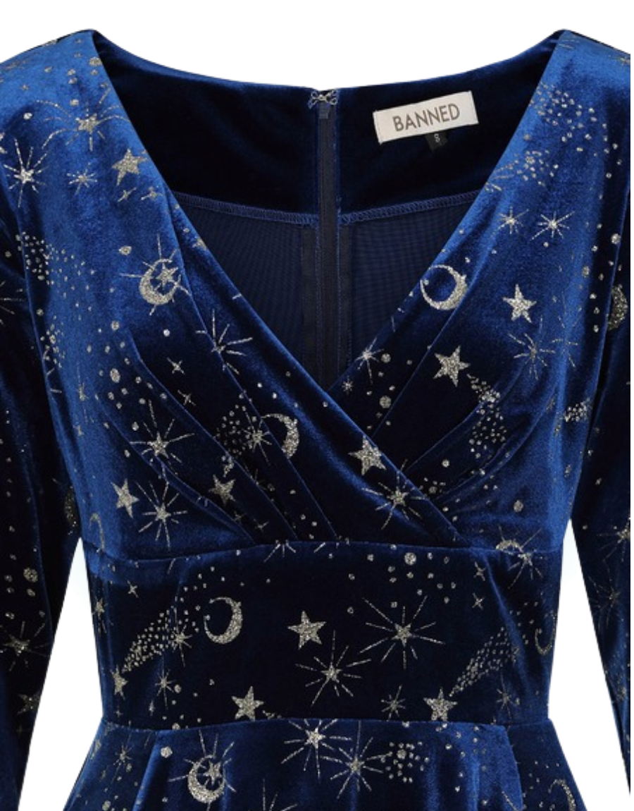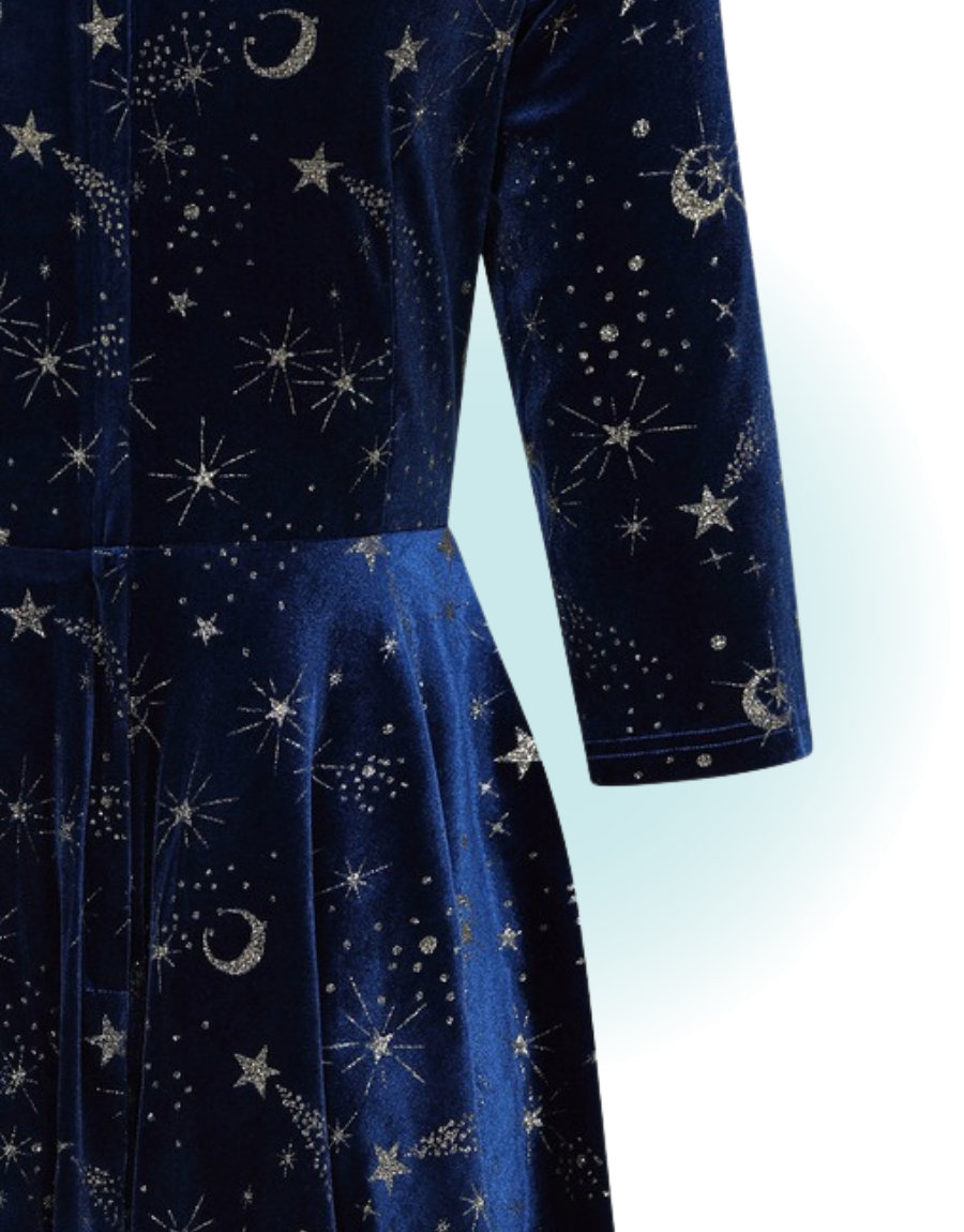 La robe Gloria Celestial est la robe qu'il vous faut pour briller lors de vos soirées chics. Son tissu en velours et ses motifs d'étoiles et de lunes or brillants rendent cette tenue unique et magique.