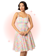 La vie est un peu plus lumineuse avec la robe Suzon multicolore. Cette robe inspirée des années 50 est en coton doux avec un imprimé pastel en vichy arc-en-ciel, car vous ne pouvez jamais avoir trop de couleur dans votre garde-robe. Son décolleté en coeur, ses bretelles réglables surmontées d’un joli nœud, ainsi que son corsage ajusté vous donneront à la fois confort et style.