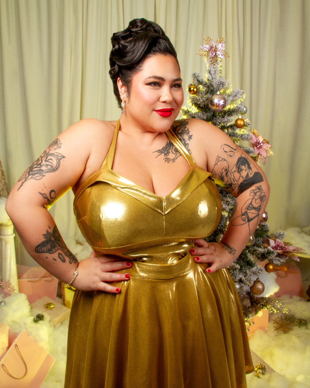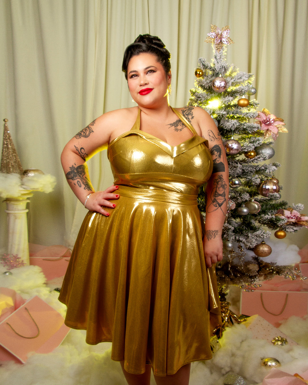 Le haut Chevy 50's est bien plus qu'un simple vêtement. C'est une pièce iconique qui marie parfaitement style rétro et modernité. Ce haut gold est conçu pour sublimer votre silhouette avec son design licou flatteur et sa fermeture Éclair distinctive au dos.