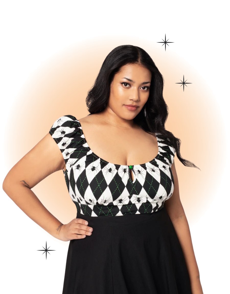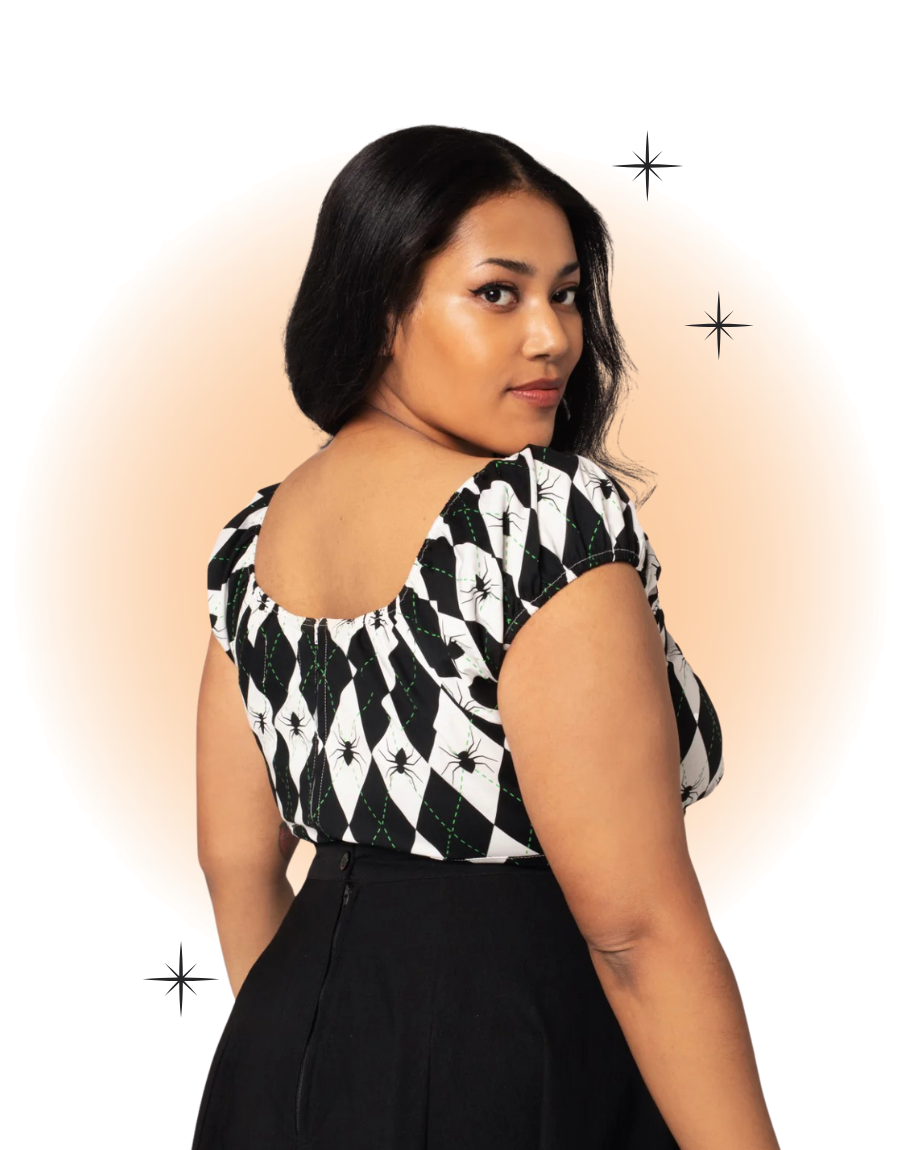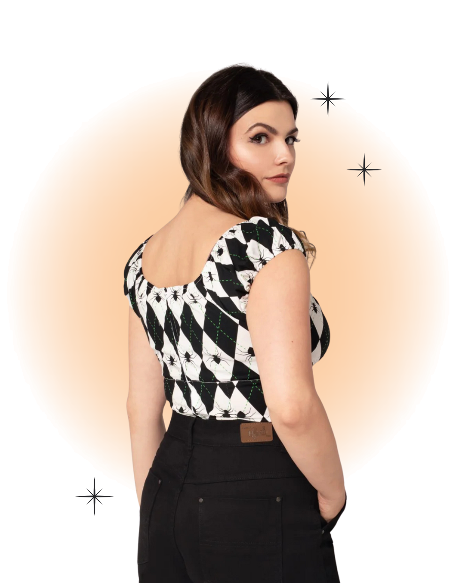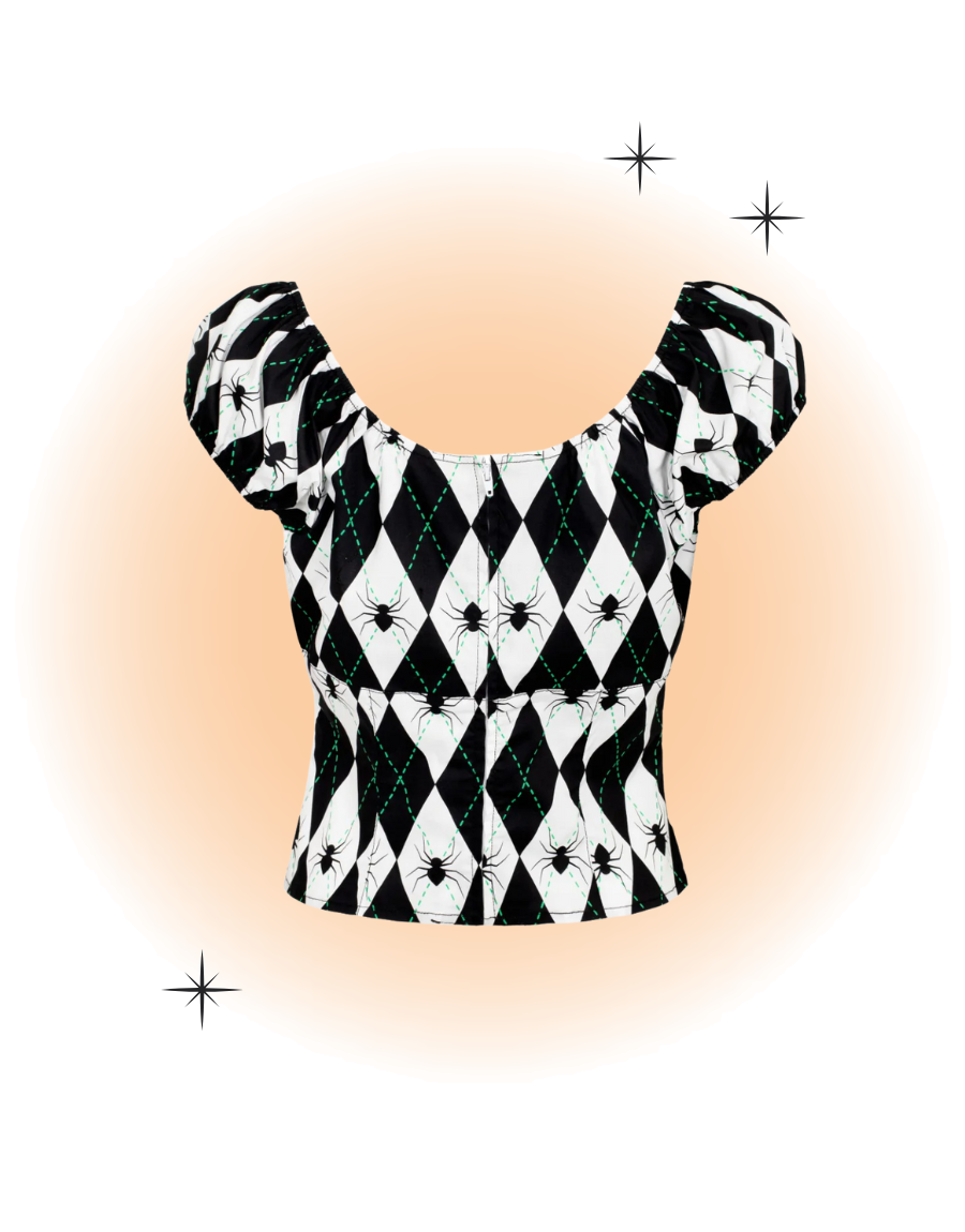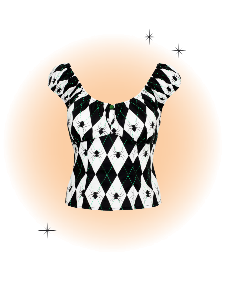 Le top Regina noir et blanc avec ses motifs de losanges et d'araignées fera de vous la reine de la saison d'Halloween.