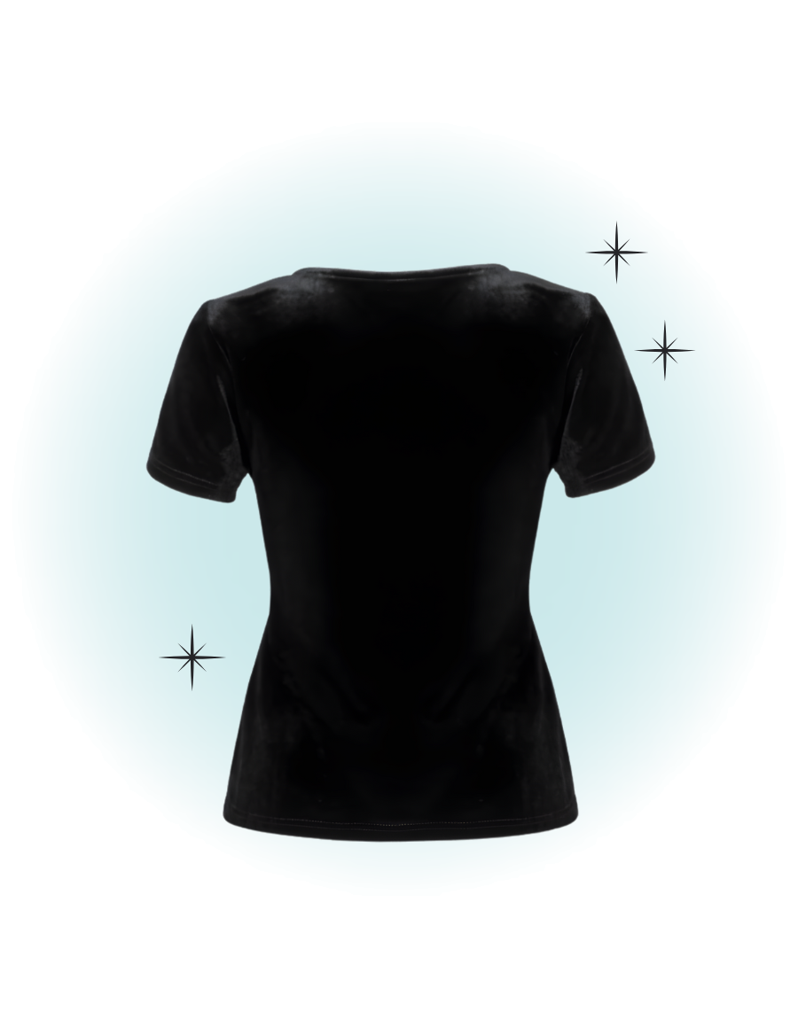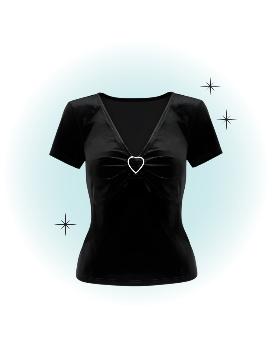 Haut en velours stretch noir au décolleté en V vertigineux, sublimé d’un fermoir cœur argenté et de fines fronces. Coupe ajustée jusqu’aux hanches, à porter rentrée pour un look sophistiqué ou libre pour une allure rebelle et sensuelle.