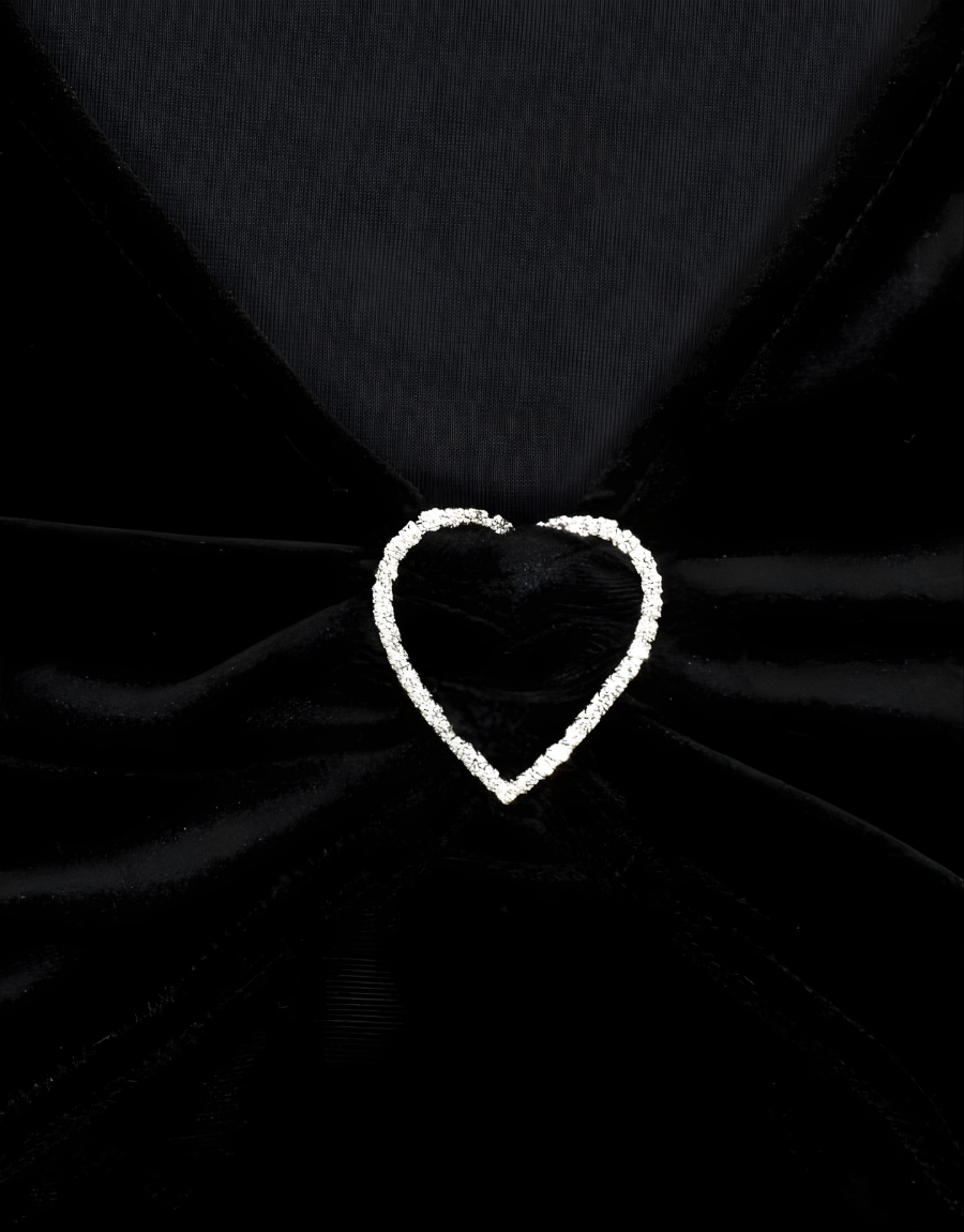 Décolleté : V profond structuré par un fermoir cœur argenté scintillant